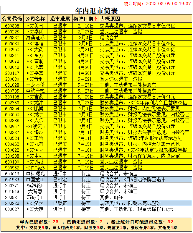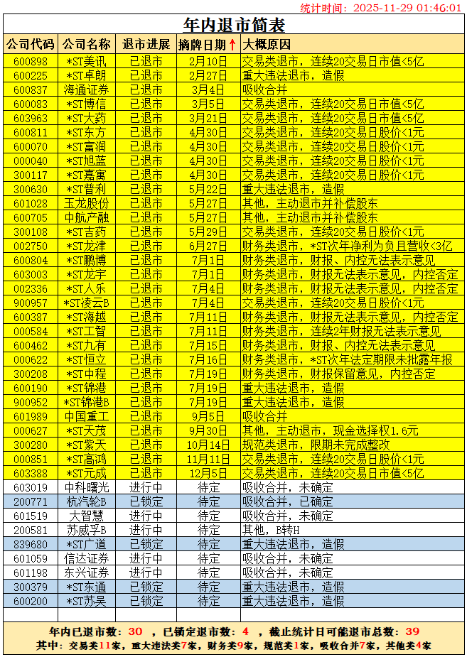 至此,2025年摘牌退市公司数量确定为32家。其中A股29家,B股3家。如下图所示。