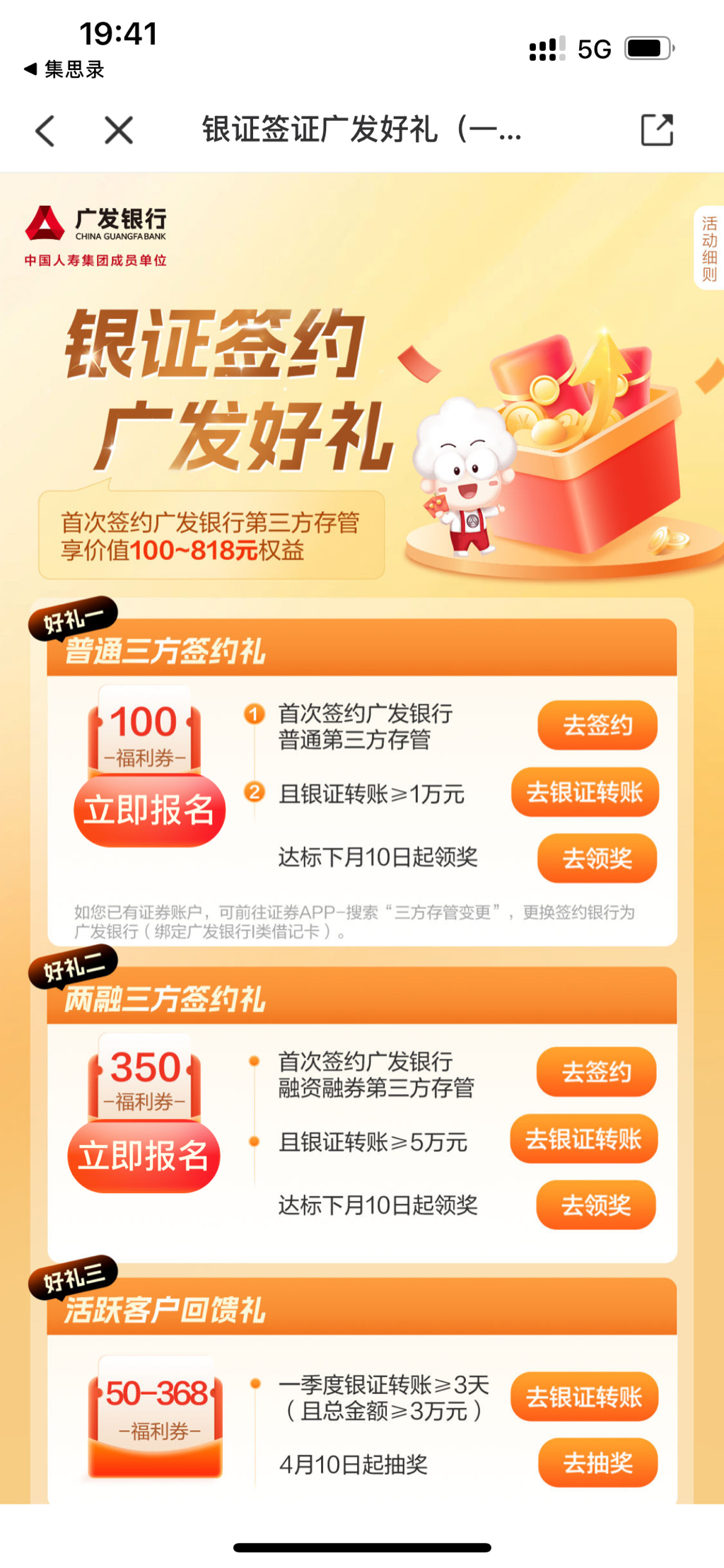 交通银行也有交行这个要怎么领? 点击“去签约”然后就选择券商了,跳转券商就是去开户的页面了。