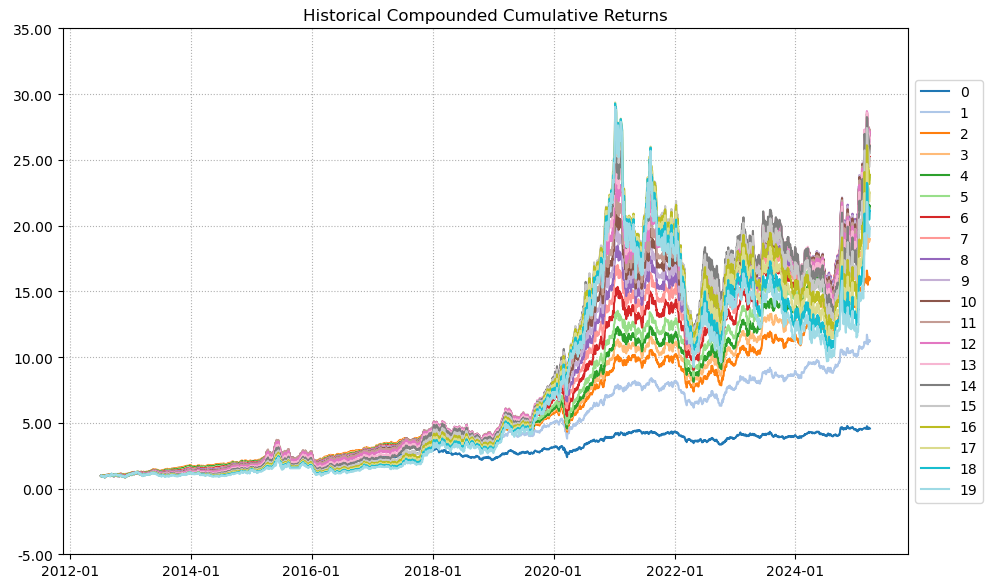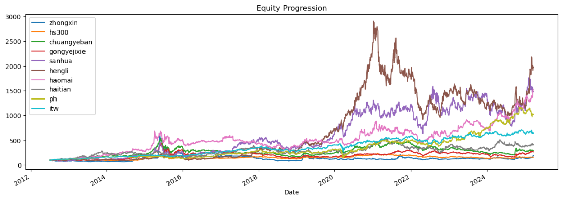 区间累计回报近18倍,最大回撤35.5%,投资组合的整体表现远好于中信重工个股。整个工业机械行业盈利能力优秀,波动中低,夏普比率1.29极具竞争力。(注:累计回报看Cumulative Returns那一栏,越高越好;最大回撤看Maximum Drawdown那一栏,越低越好)
