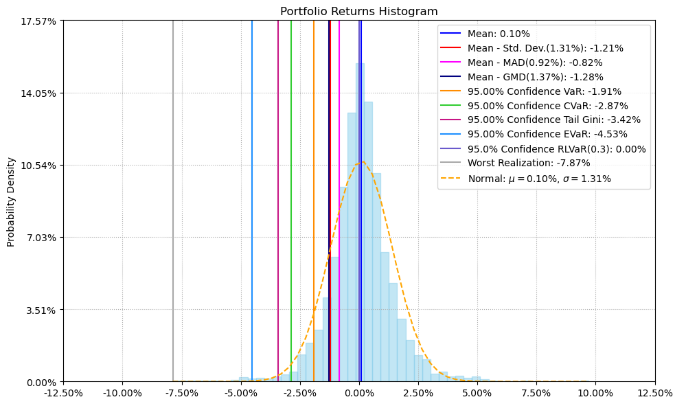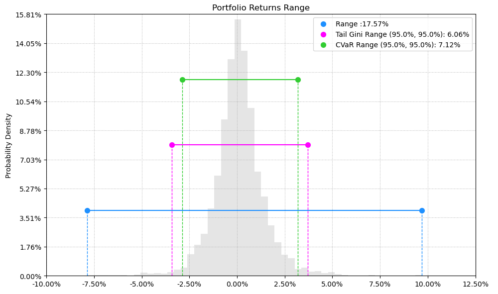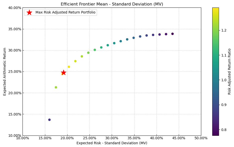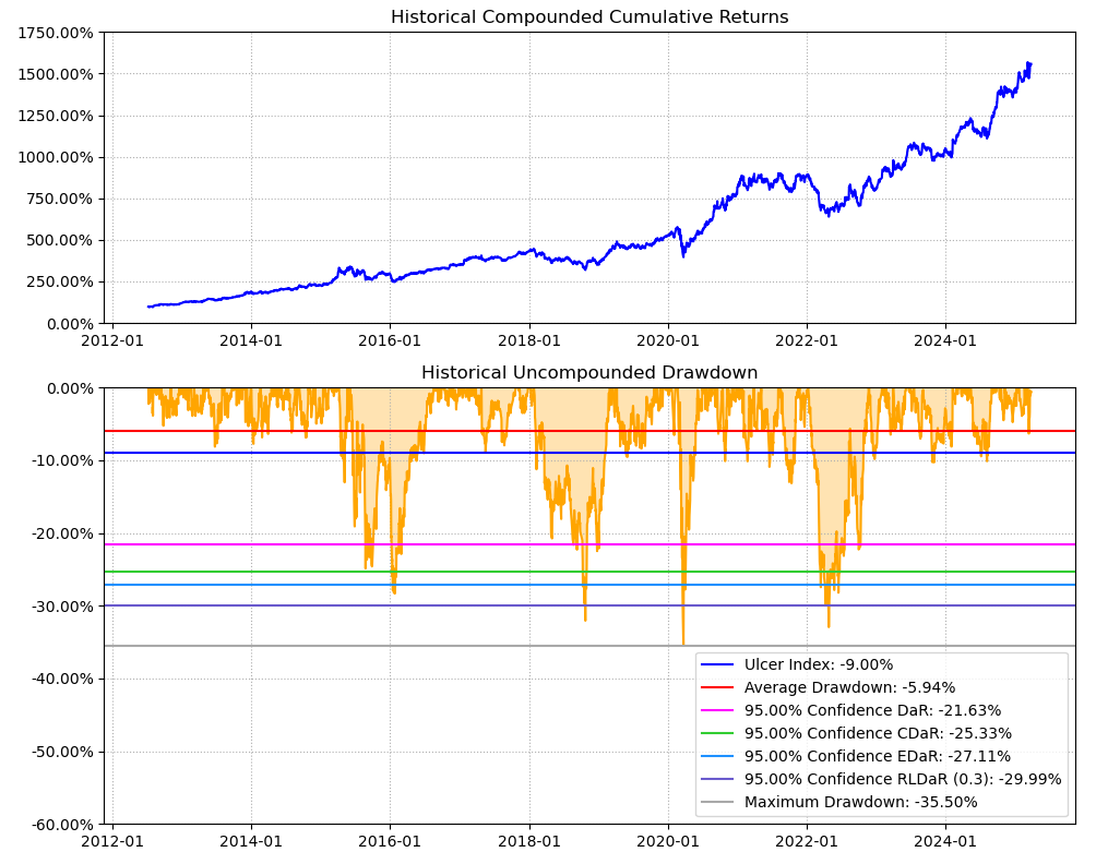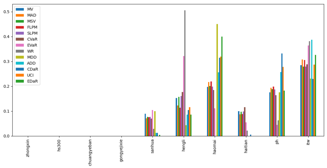最后看下整个投资组合的情况,日度均值回报在0.10%,比上次测的机械重卡行业高40%,而且7.12%的CVaR波动还更低。(注:均值回报看Mean那一栏,越高越好;CVaR波动看CVaR那一栏,越低越好)