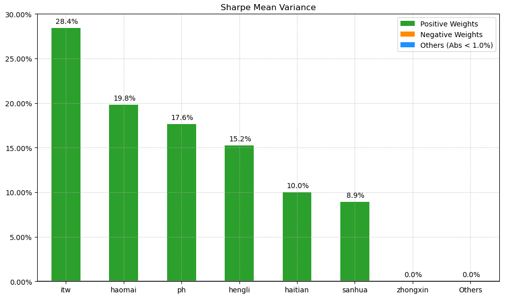 按最高夏普比率配置的话,系统给的权重为零,最大权重给了美股的伊利诺伊工具占比28.4%。(注:占比越高越好)