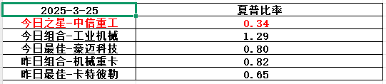 中信重工,基本面中规中矩,历史表现行业垫底,目前估值还高,不建议关注。整个工业机械行业历史表现亮眼,波动也不大,综合夏普比率非常诱人,建议重点关注,全球市场看伊利诺伊工具,大中华市场看豪迈科技。(注:夏普比率越高越好)