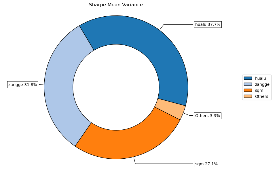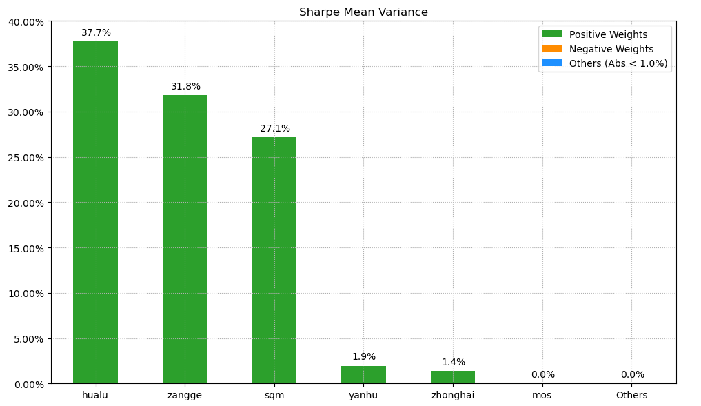 按最高夏普比率配置的话,系统给的权重为零,最大权重给了华鲁恒升占比37.7%。(注:占比越高越好)