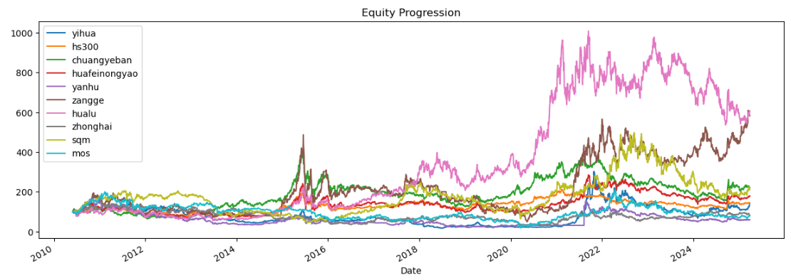 区间累计回报近10倍,最大回撤52.21%,投资组合的整体表现远好于湖北宜化个股。整个化肥农药行业盈利能力还行,波动偏大,夏普比率0.67令人失望。(注:累计回报看Cumulative Returns那一栏,越高越好;最大回撤看Maximum Drawdown那一栏,越低越好)
