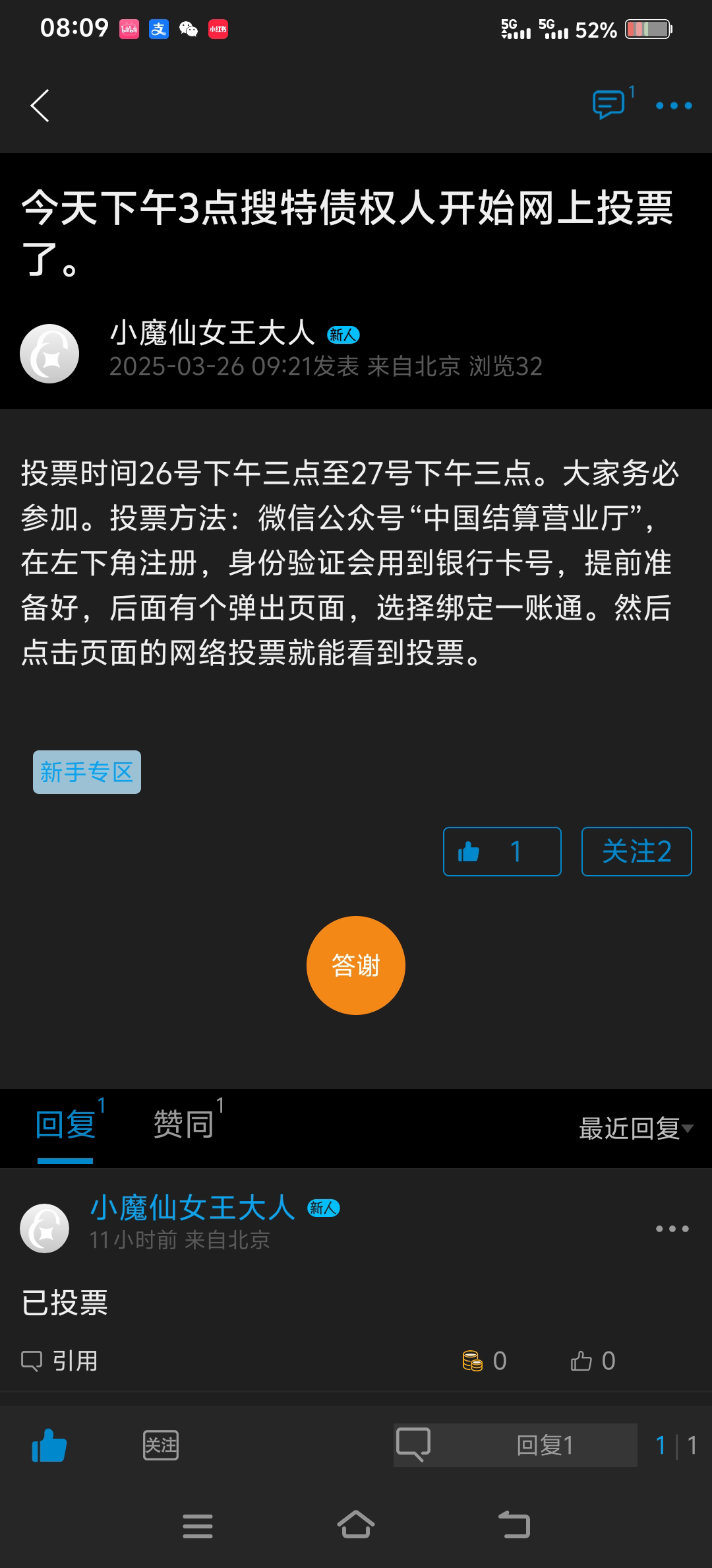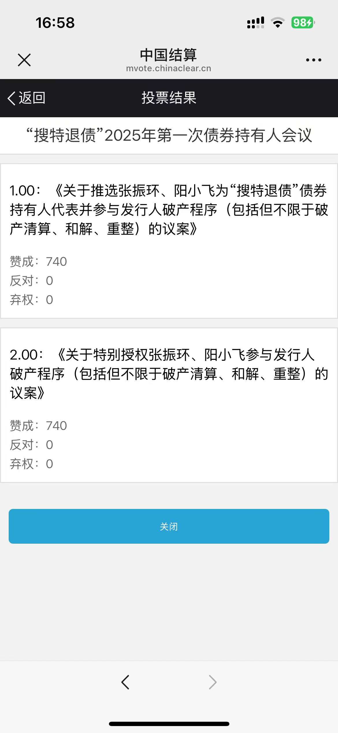有搜特退债的注意了,今天27号下午三点前是投票的最后时间,请尽快投票。