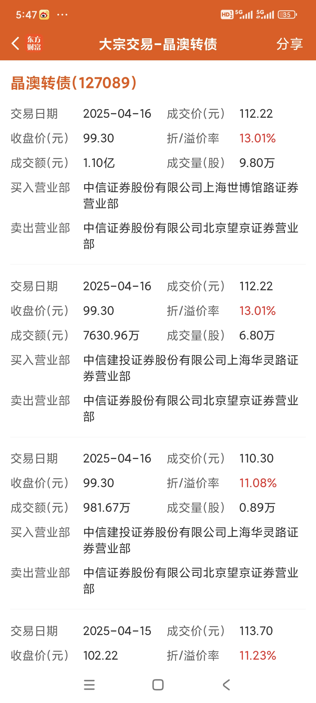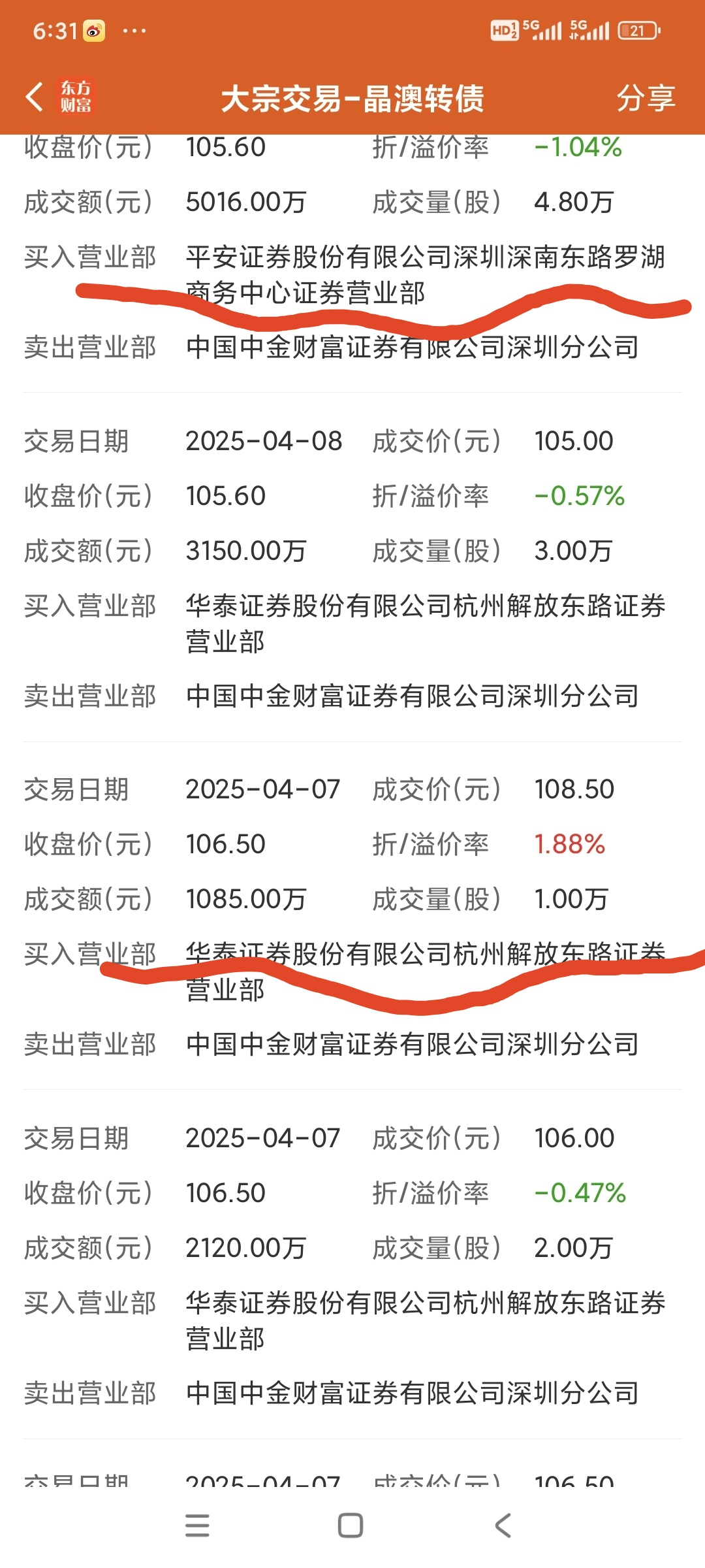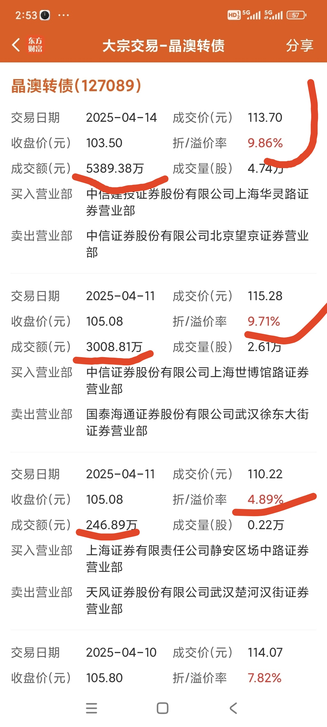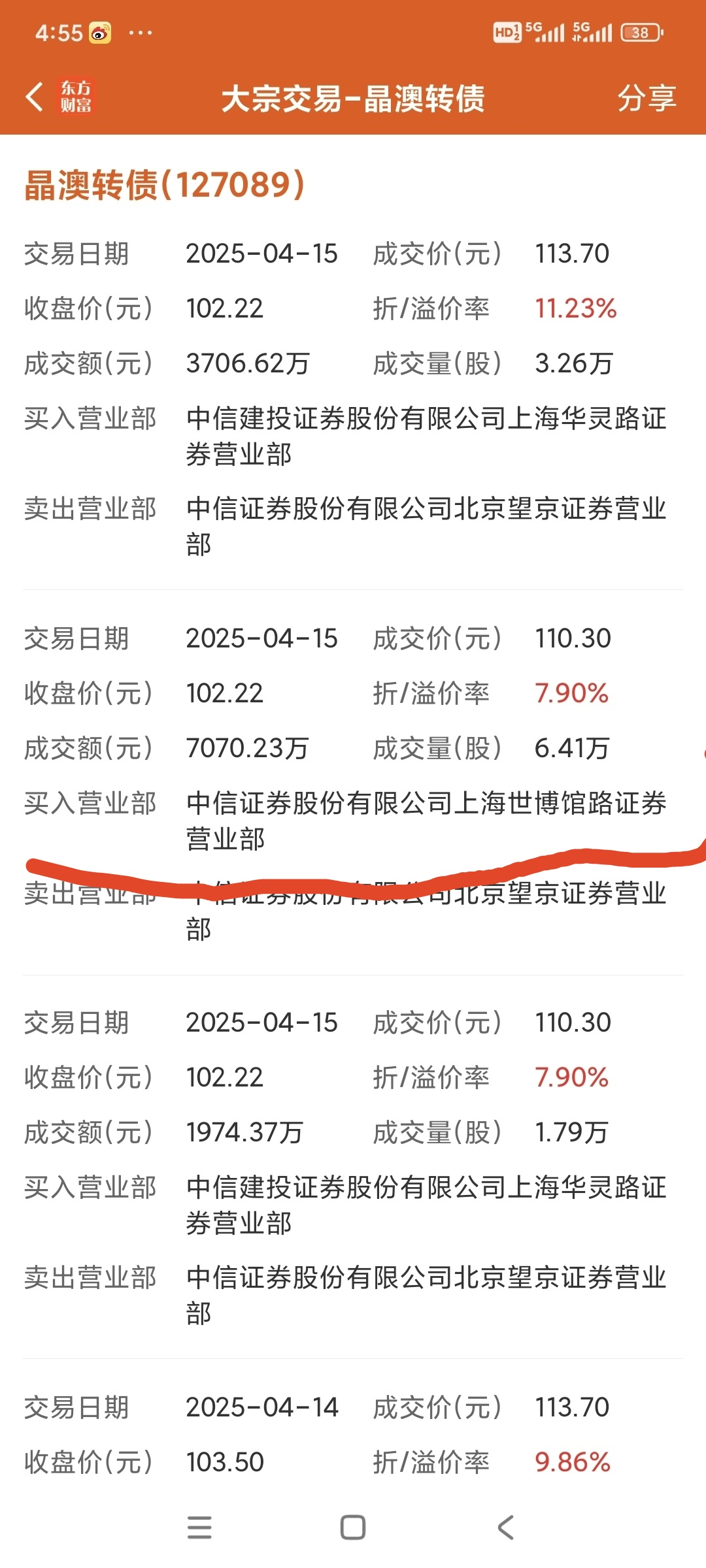 大宗交易也显示,最近几个亿、几个亿大量在110以上交易。