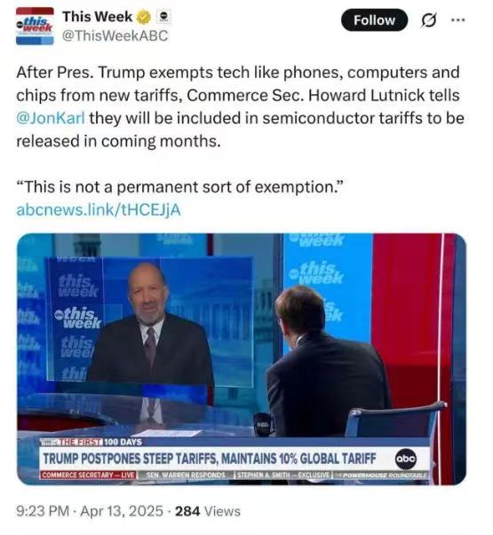 还需要再求证一下你这个图的第二点特别搞笑,所有国家(除了中国)特定对等关税的暂免90天(不免10%的基准对等关税),和豁免产品清单完全是两个逻辑。