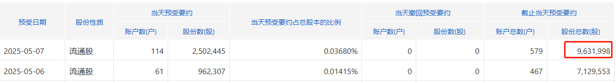 截止5月8日,已经预约14.9亿股,距离下限4.1亿股。当天预约1.4亿股。