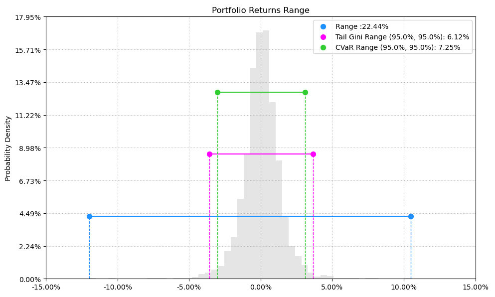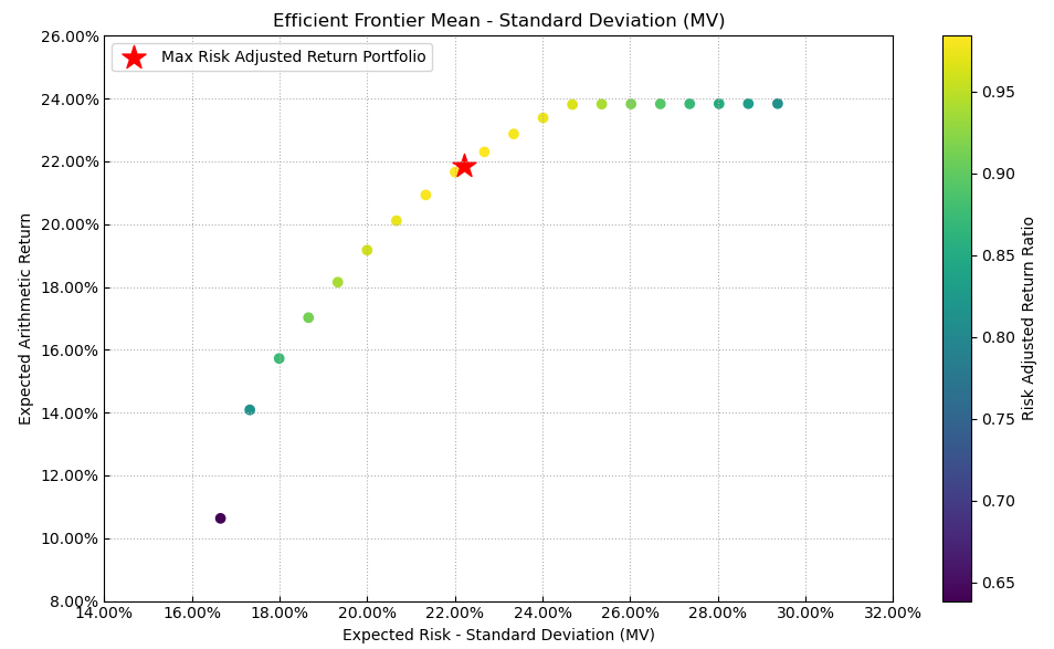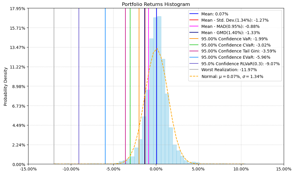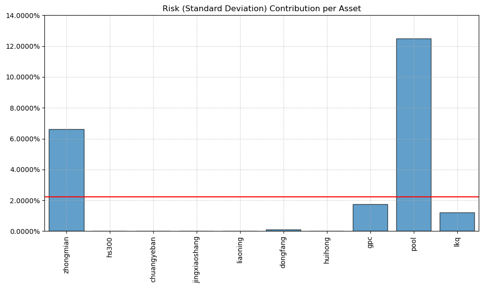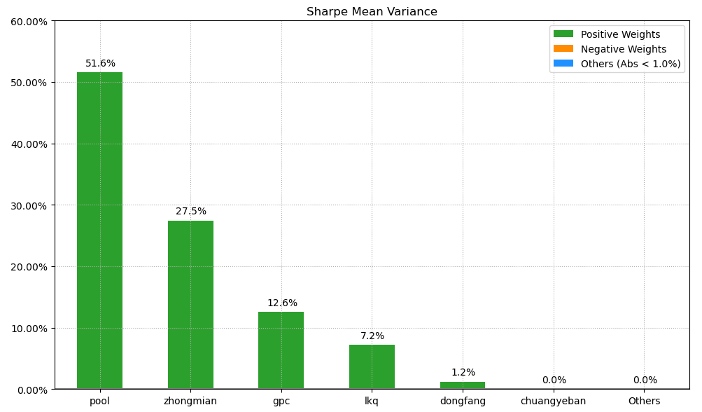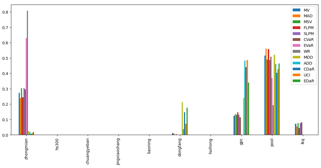 最后看下整个投资组合的情况,日度均值回报在0.07%,比上次测的食品肉类行业低10%,而且7.25%的CVaR波动还要更大一些。(注:均值回报看Mean那一栏,越高越好;CVaR波动看CVaR那一栏,越低越好)