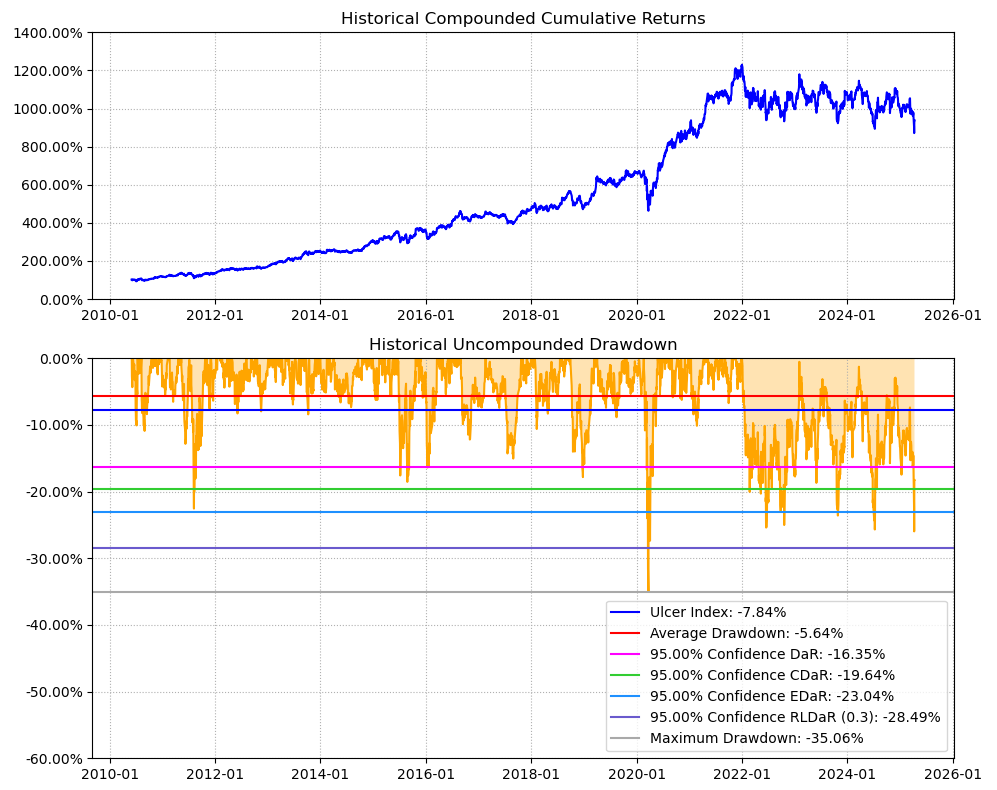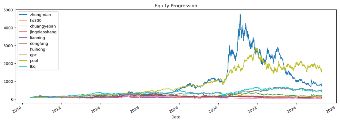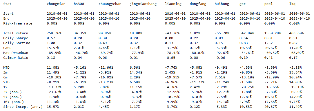 区间累计回报近12倍,最大回撤35.06%,投资组合的整体表现要好于中国中免个股。整个经销商行业盈利能力还行,波动中低,夏普比率0.98中规中矩了。(注:累计回报看Cumulative Returns那一栏,越高越好;最大回撤看Maximum Drawdown那一栏,越低越好)
