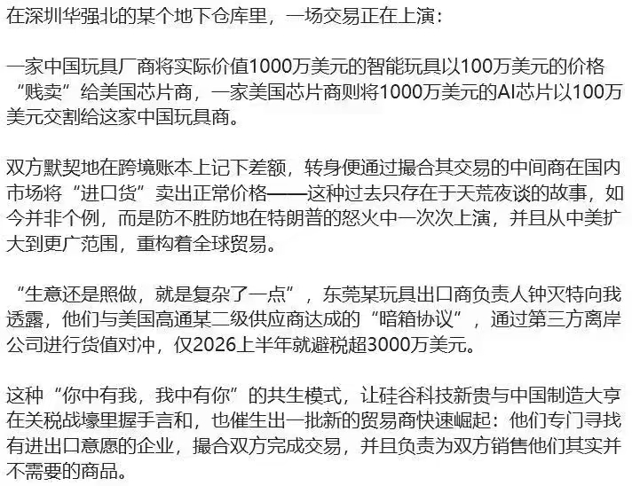 如果东南亚那几个国家(柬埔寨除外)以全面倒向美国为筹码,谈判时学我们,例如要求本地办厂且股权不能高于49%,不本地办厂的话就缴巨额关税,美国可能会默许而不对他们加关税,不过对我们而言,就是饮鸩止渴了。