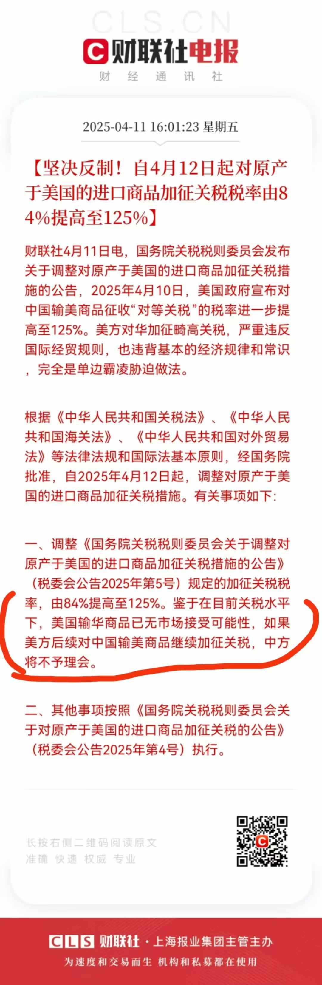 调整《国务院关税税则委员会关于调整对原产于美国的进口商品加征关税措施的公告》(税委会公告2025年第5号)规定的加征关税税率,由84%提高至125%。鉴于在目前关税水平下,美国输华商品已无市场接受可能性,如果美方后续对中国输美商品继续加征关税,中方将不予理会。