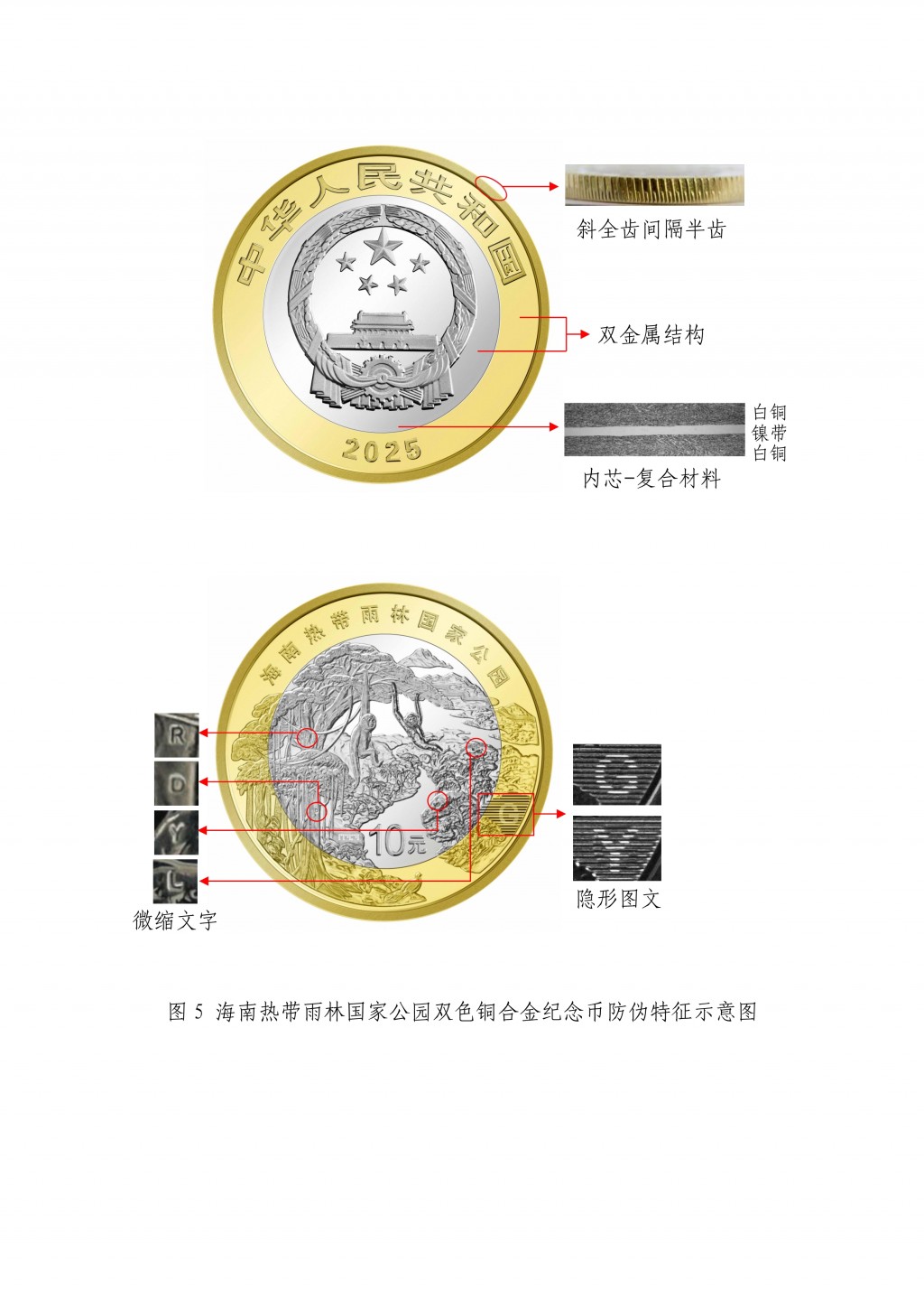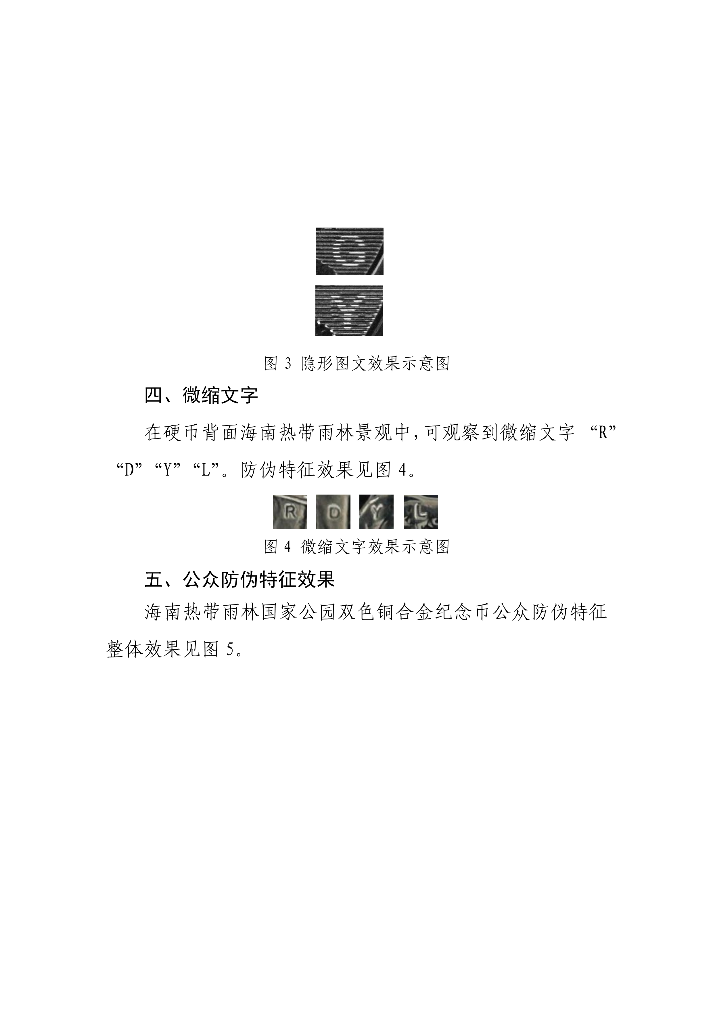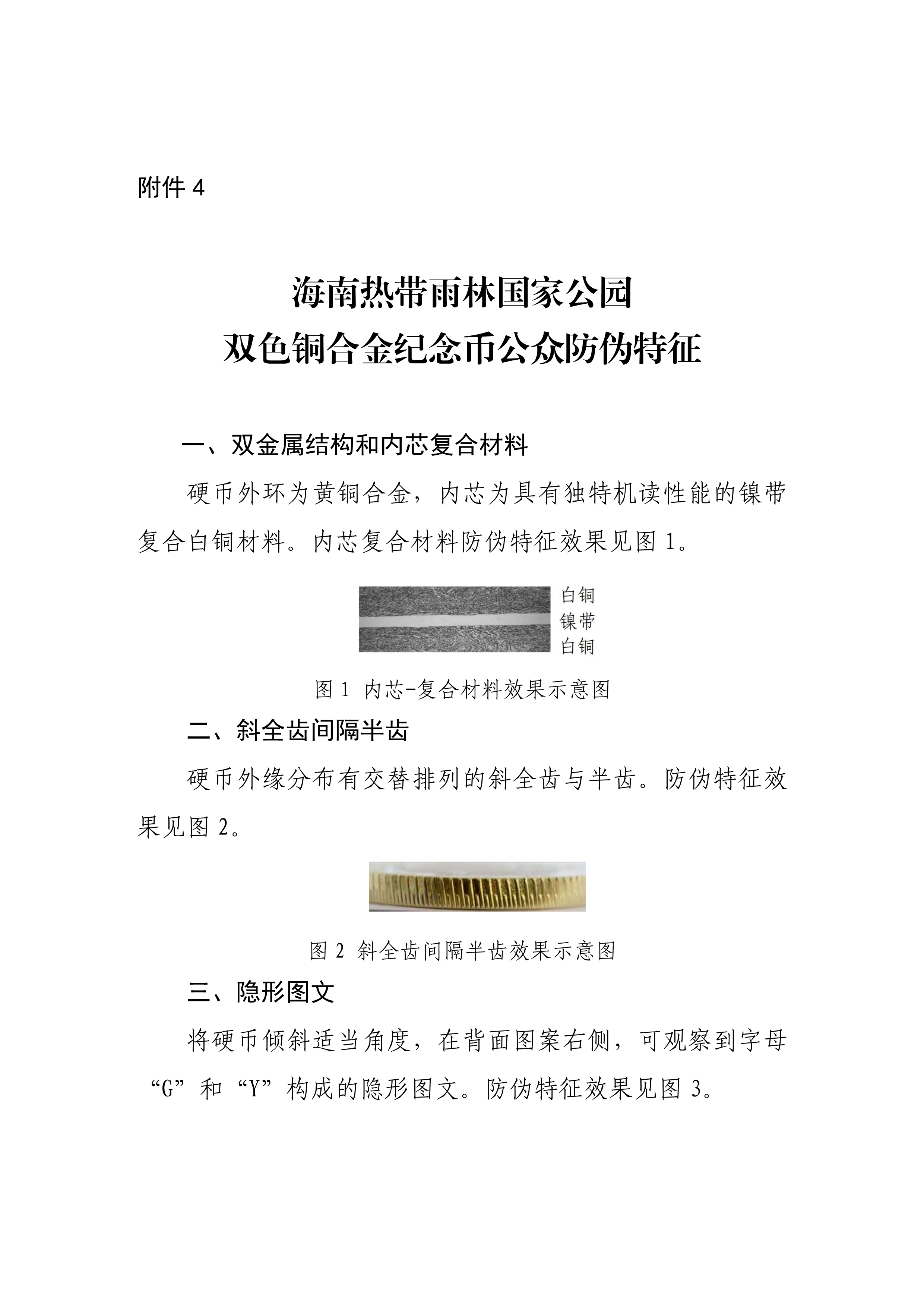 (四)海南热带雨林国家公园双色铜合金纪念币公众防伪特征见附件4。