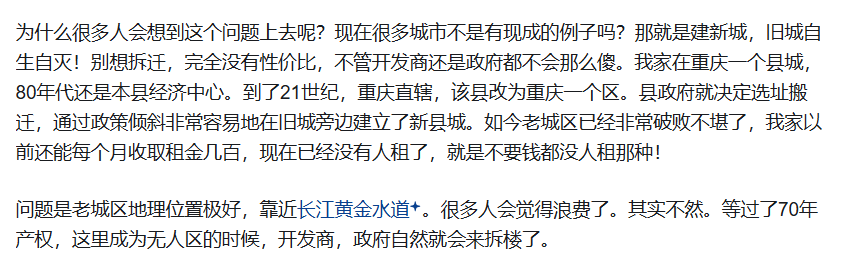老破小当年也是小甜甜,但是老破小拆迁重盖成本低,而现在的房子以后变成老破高,不会有哪个开发商钱多人傻的去拆迁高层楼房重盖吧,在知乎上看到一个回答,让我想到了另一个思路,就是老城搬新城,让老城逐步迁移,我老家就是这样,想到现在的雄安新区,也是个解决办法,只是散户又变成韭菜了