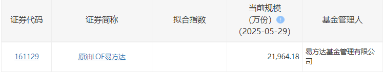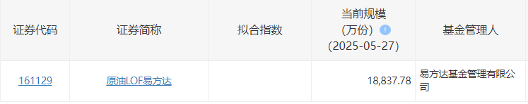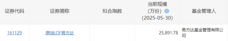 2025年4月28日,原油LOF易方达场内规模12,145.83万份,新增4,087.17万份,相当于8万辆拖拉机申购。