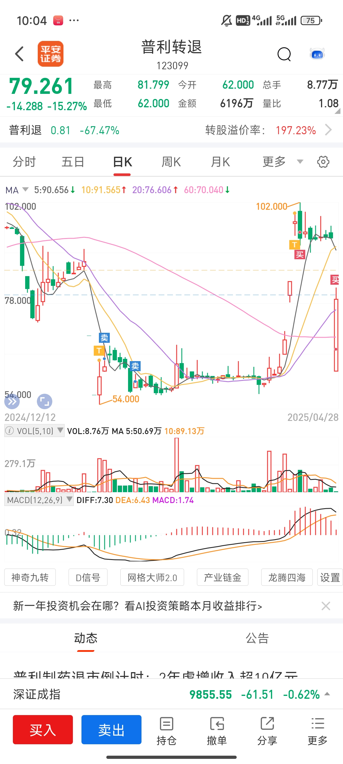 之前小账户普利转债忘记卖掉了,早上手忙脚乱开通了权限,把仅有的几千块买入了普利转债,79快多80元全部抛掉了,挽回一点损失也好啊。。。。