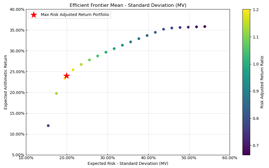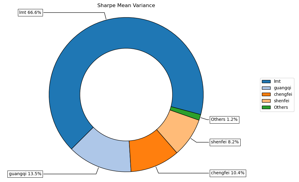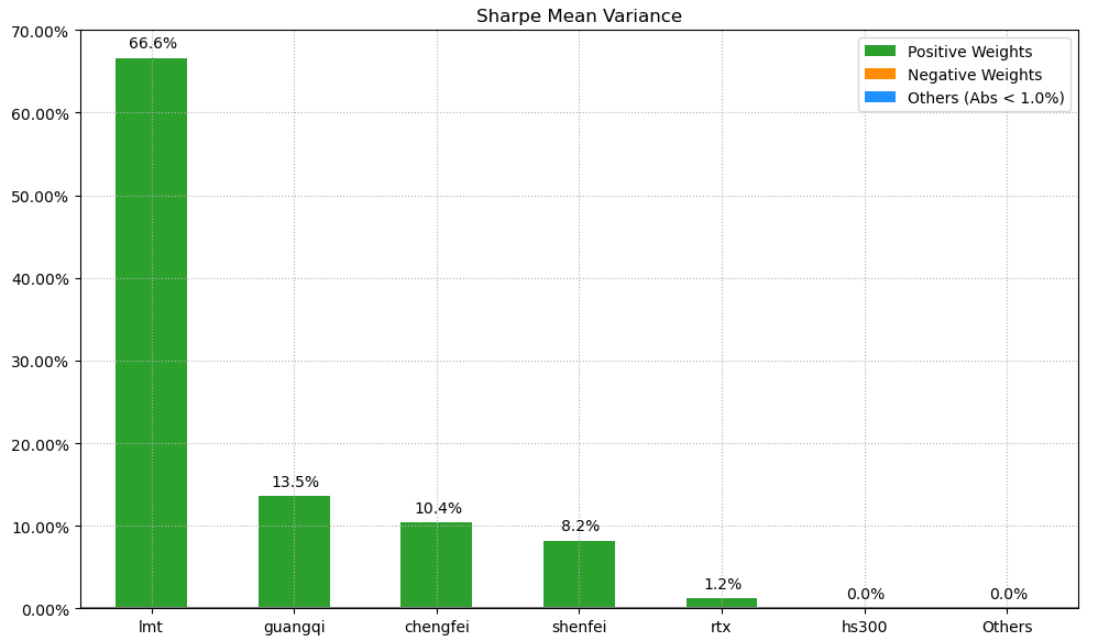 按最高夏普比率配置的话,系统给的权重为10.4%,最高权重给了美股的洛克希德马丁占比66.6%。(注:占比越高越好)