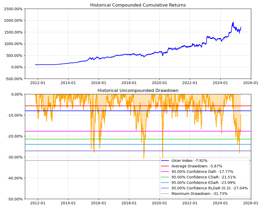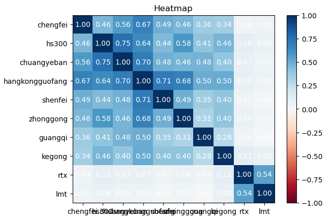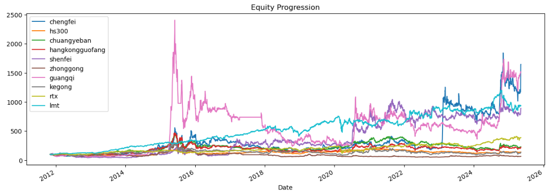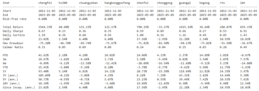 区间累计回报近20倍,最大回撤31.73%,投资组合的整体表现要好于中航成飞个股。整个航空国防行业盈利能力卓越,波动低,夏普比率1.21很惊艳。(注:累计回报看Cumulative Returns那一栏,越高越好;最大回撤看Maximum Drawdown那一栏,越低越好)
