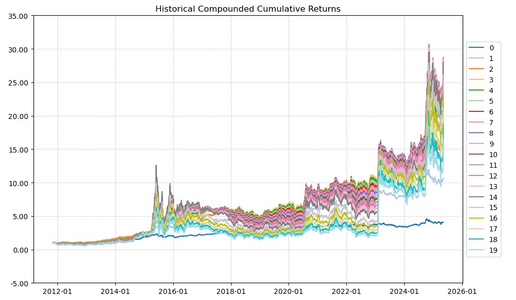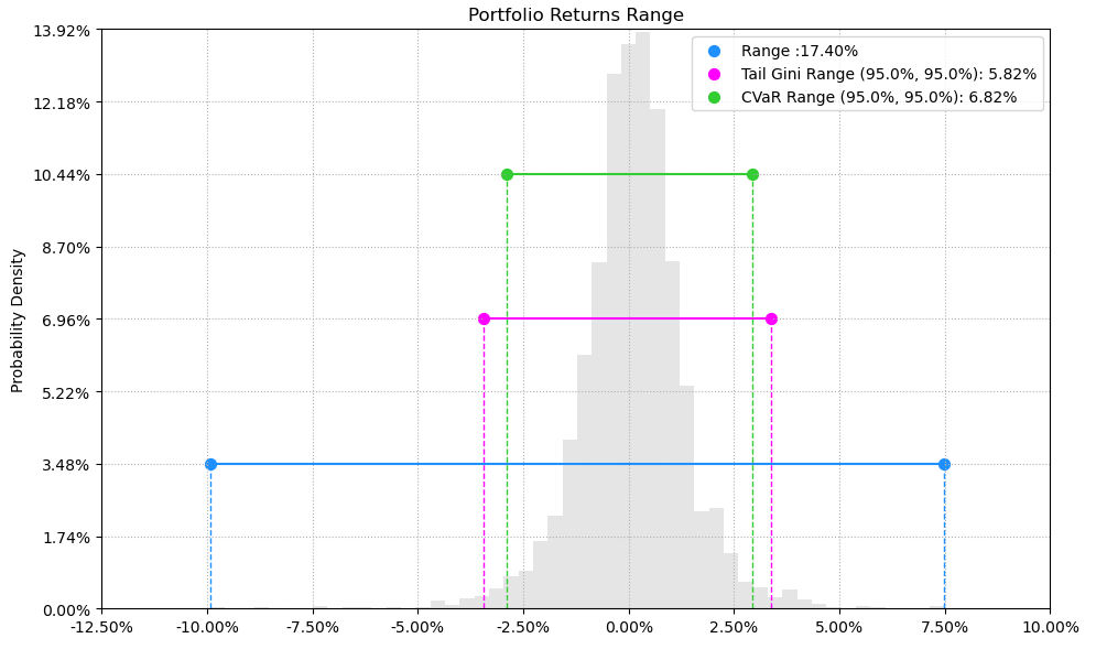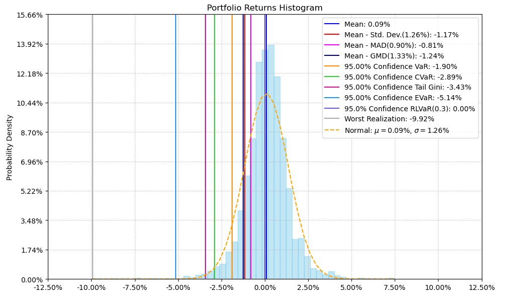 最后看下整个投资组合的情况,日度均值回报在0.09%,跟上次测的电子设备行业差不多,而且6.82%的CVaR波动还更小。(注:均值回报看Mean那一栏,越高越好;CVaR波动看CVaR那一栏,越低越好)