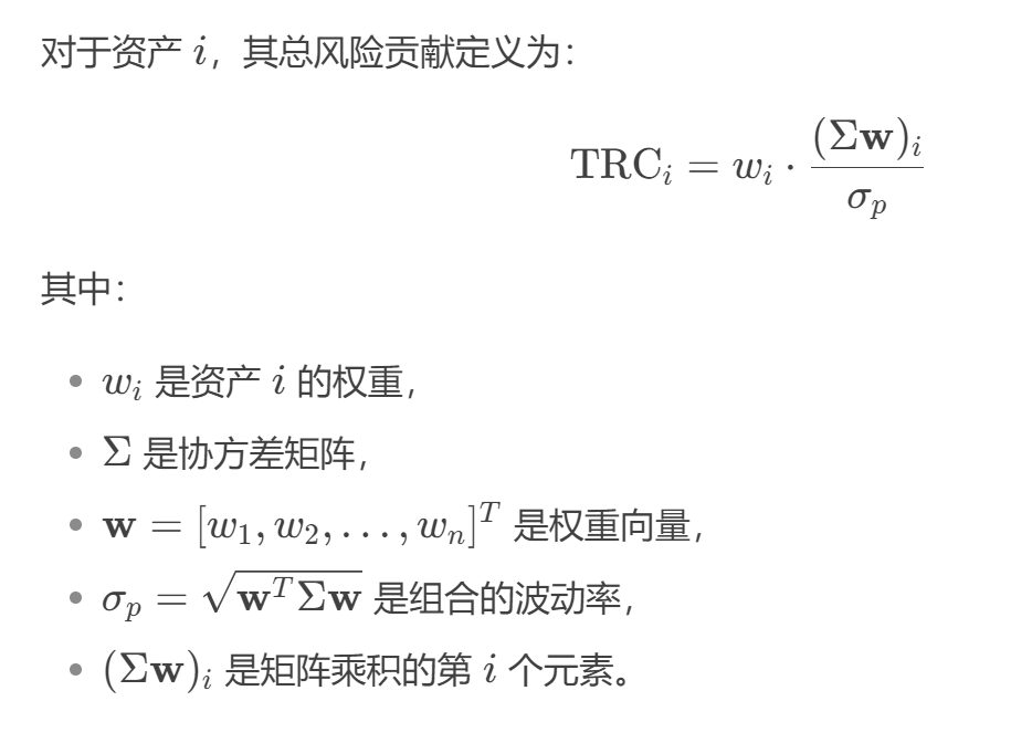 风险平价模型是一整套非线性函数,其数学核心是确保每个资产的权重与其边际风险贡献的乘积相等,从而实现风险均衡分配。风险平价模型的核心数学条件与公式展示如下: