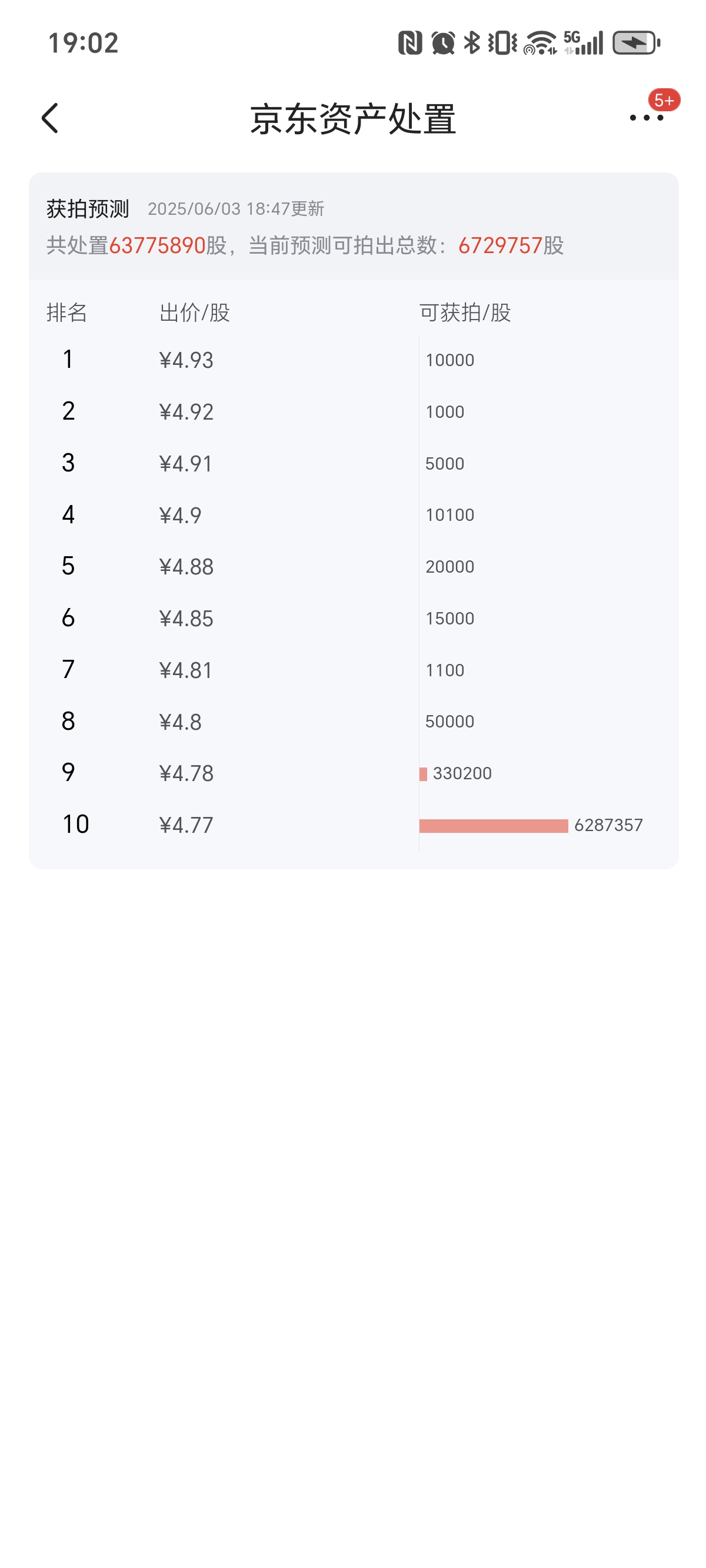 我第二次拍卖4.77元买了一千股,熟悉流程,目前股票还没有到账。当时大约折价20%。