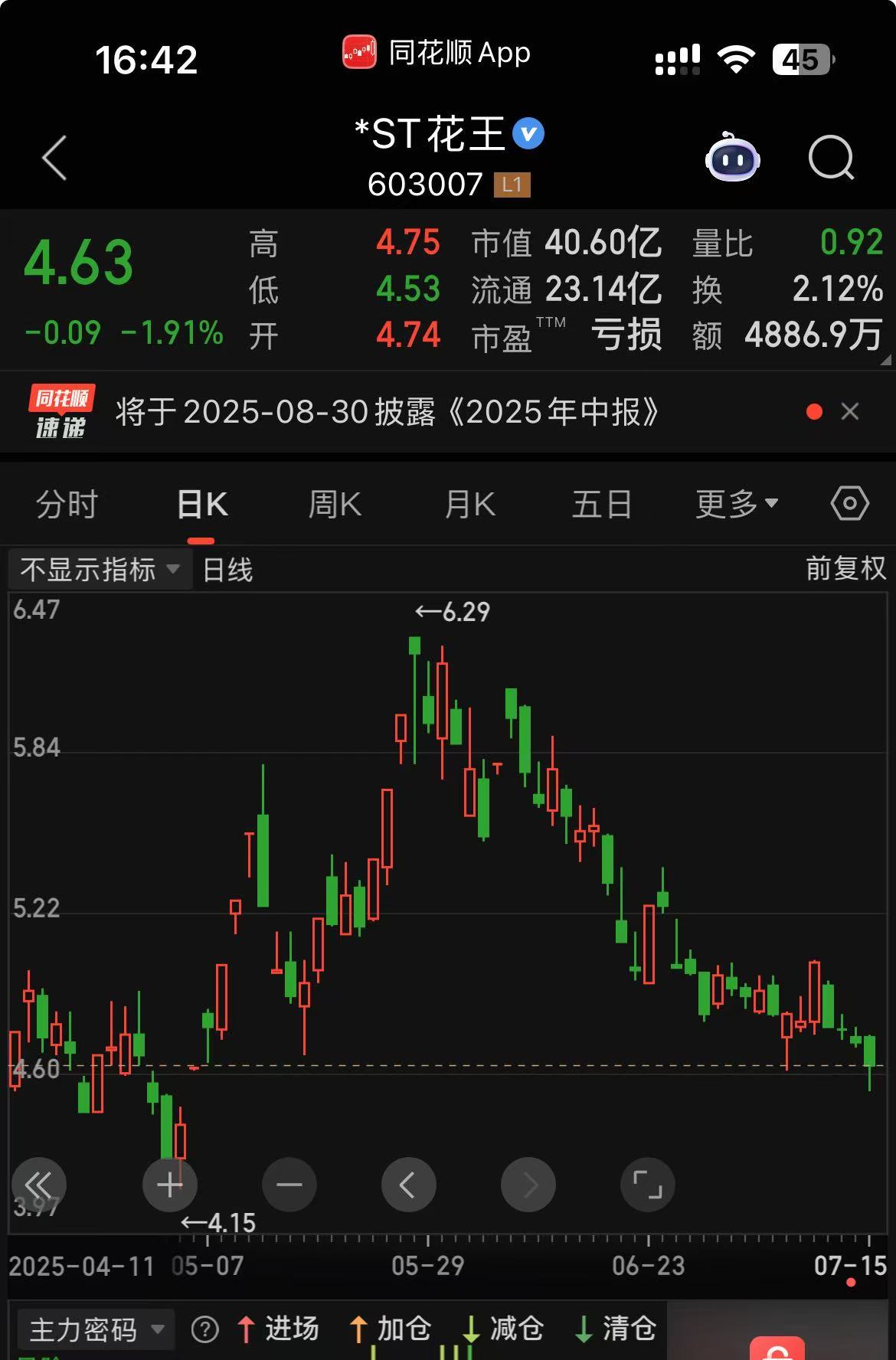 本人小拍10万股,花王刚破产重整完,尚且看好花王的未来,半年禁售期年底就可以卖出,也不用承担明年年报不过的风险。