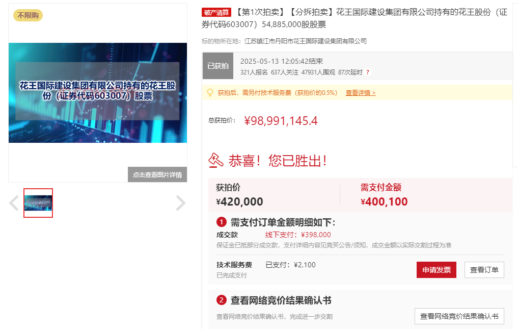 京东拍卖界面有个线下支付金额提示,然后再加上过户费,过户费就是你拍的股数*0.001