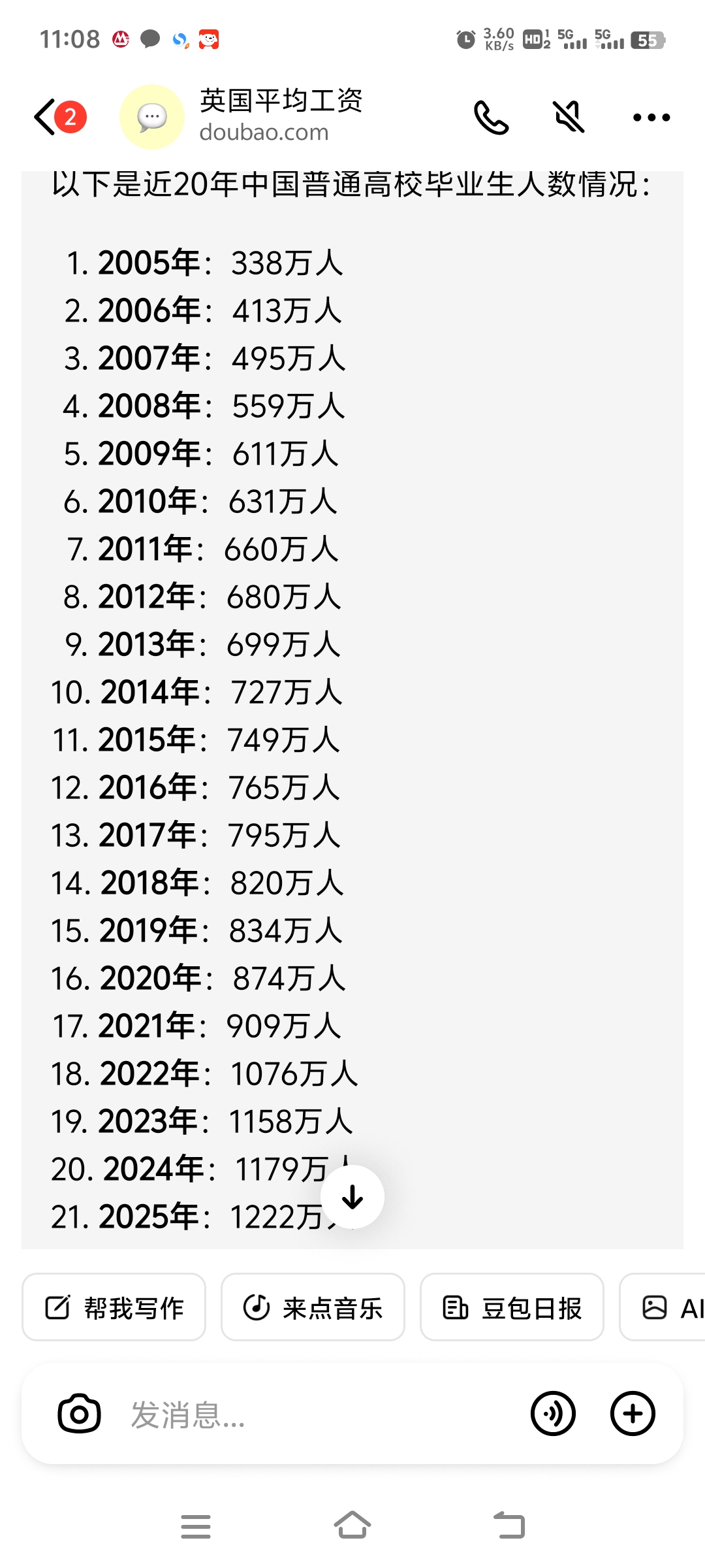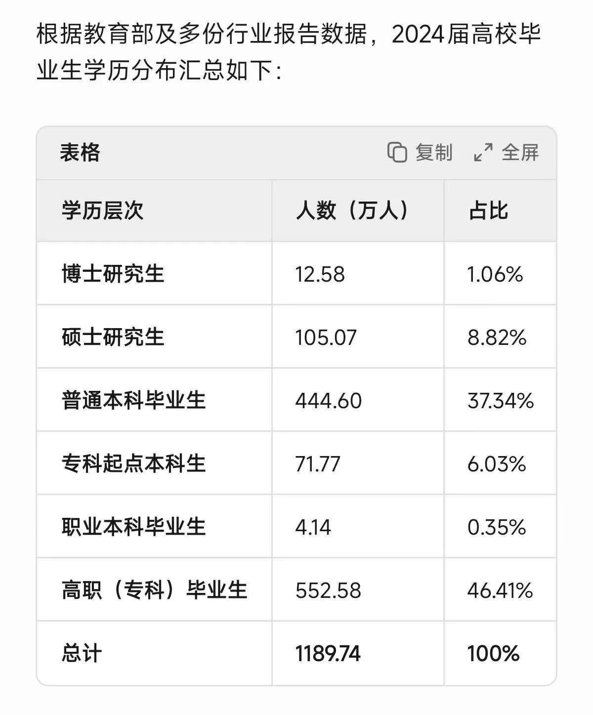 我对今年1220万大学生的数据存疑,大学毕业大概22周岁,对应出生年份是2003年,2003年全部出生人口才1650万,怎么会有这么高的大学生比例?今年退休人员是1965年出生的,当年出生人口是2650万,入职人员是1650万,劳动人口供应整整少了1000万劳动人口,之所以就业困难,根本原因是岗位与人口不匹配,低端岗过多,高端岗不足。教育部权威数据