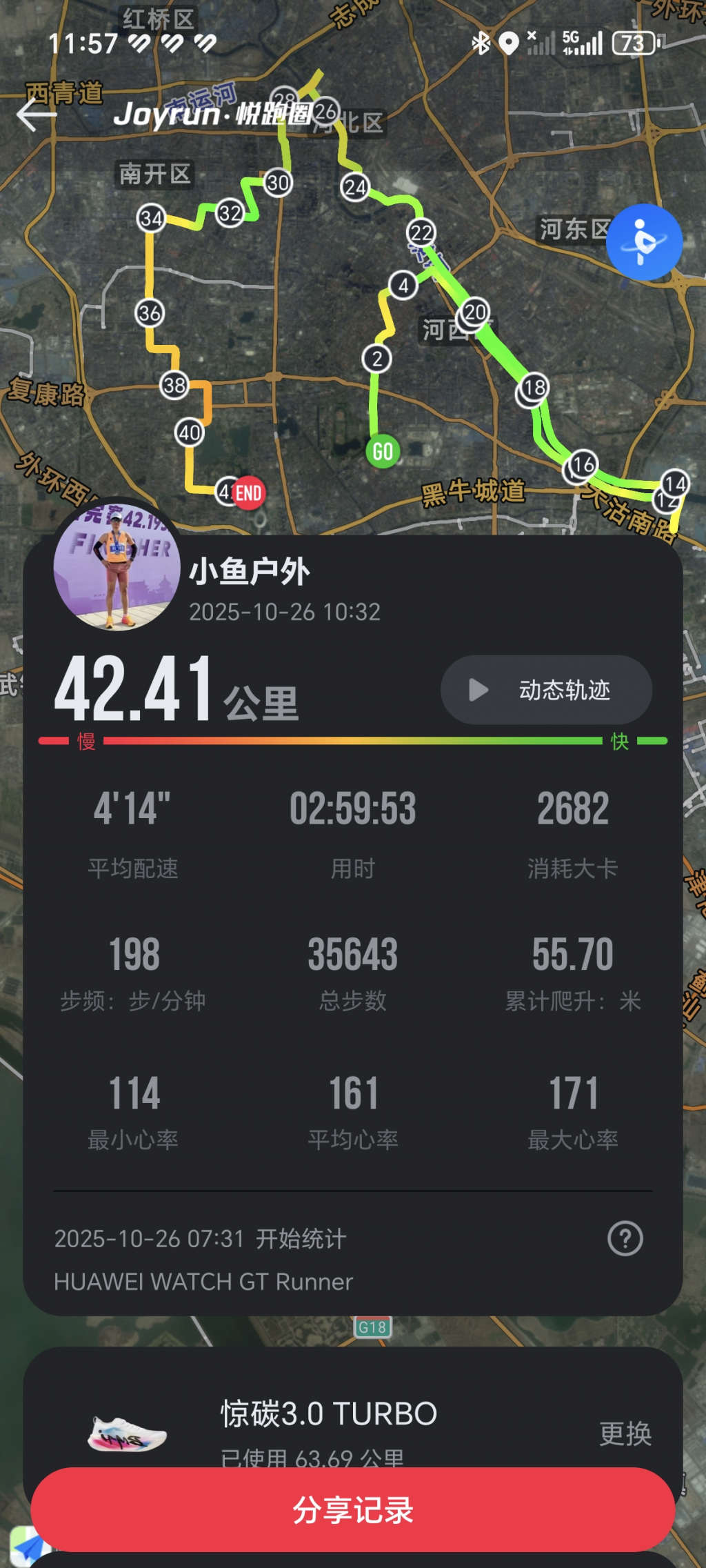 天气不如人意,跑崩了,有点难受,备战三个月,跑了近一千公里