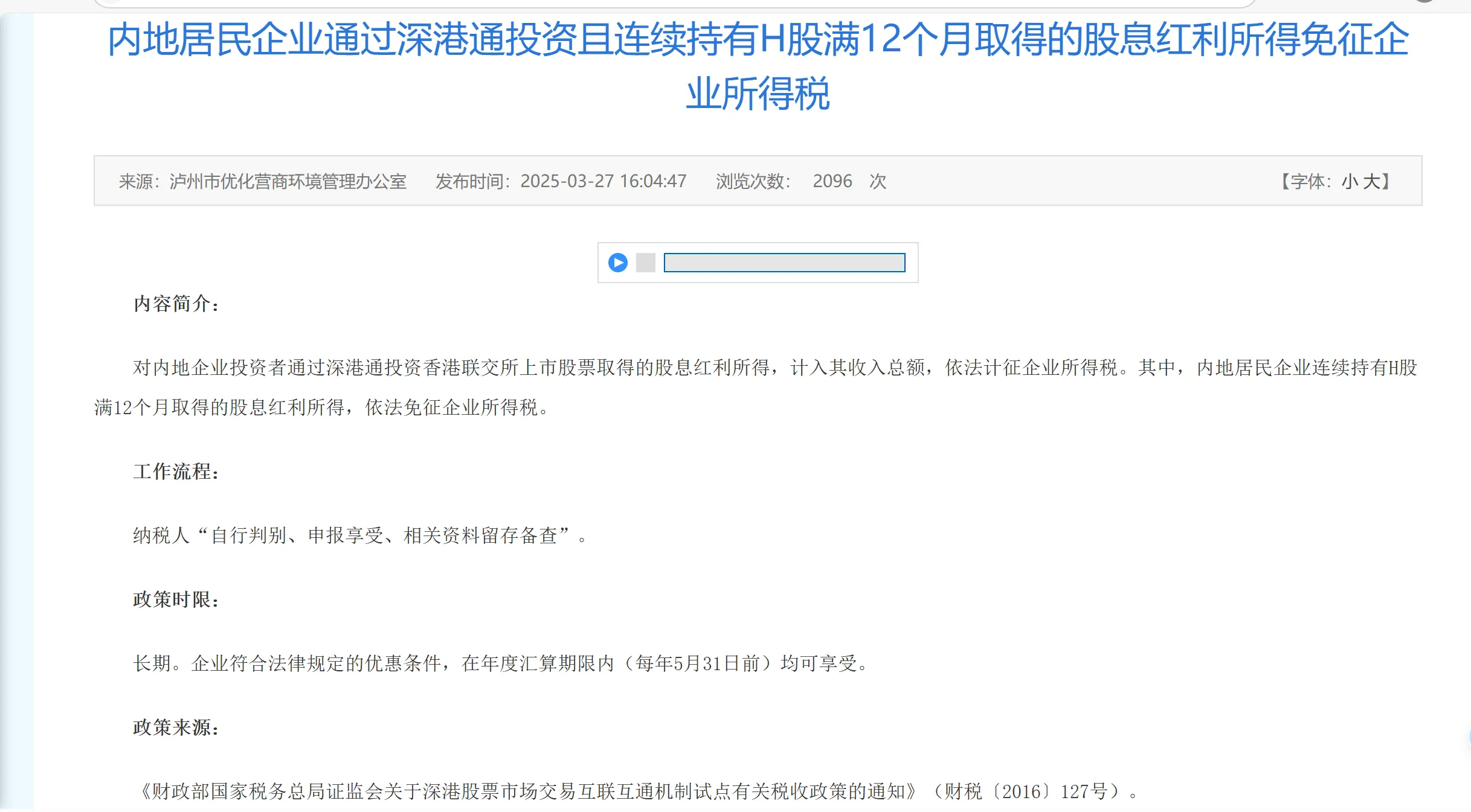可是在一些政府网站上看对于这块又是说国内企业账户投资H股,获得的股息自行报税。