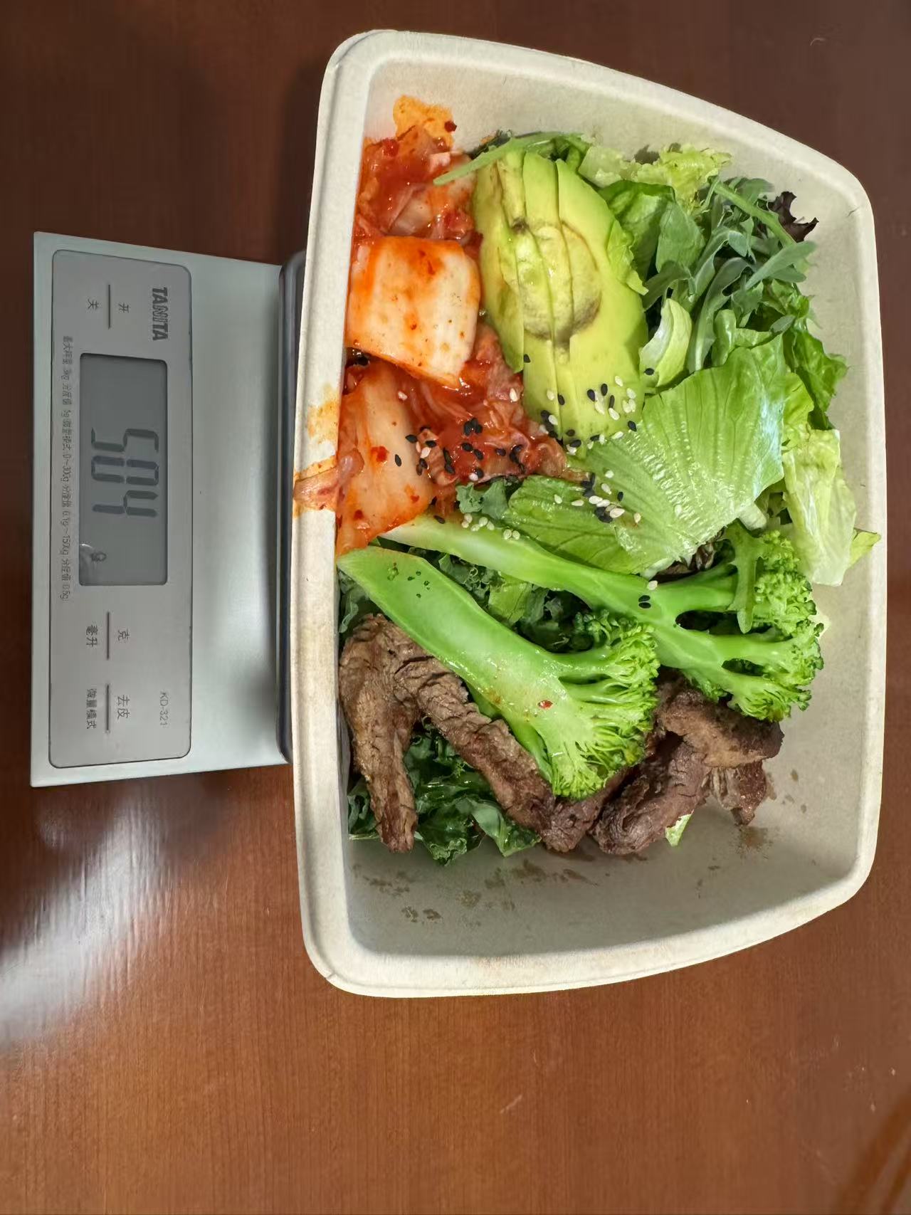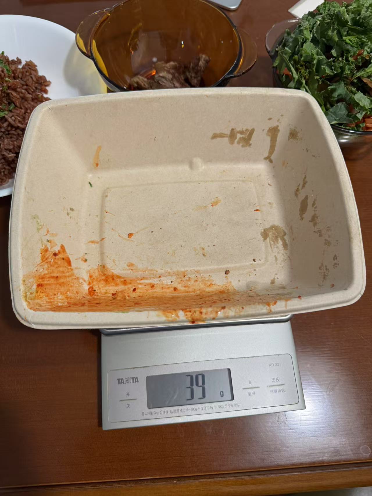 能量碗总体重量504克,去掉盒子39克,其中牛肉重量43g,米饭200克,蔬菜226克