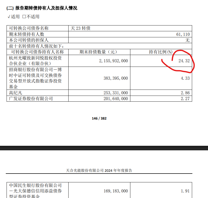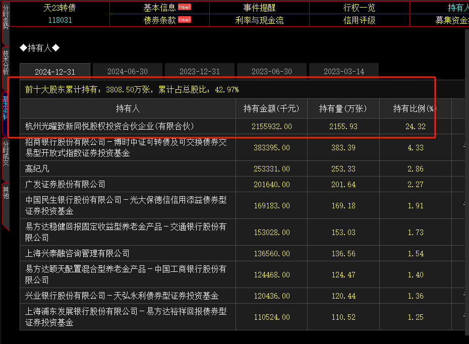 查询公司年报发现,天23转债 第一持有人 杭州光曜致新同悦股权投资合伙企业(有限合伙) 持有天23转债比例为24.32,持有金额为2155932.00千元。