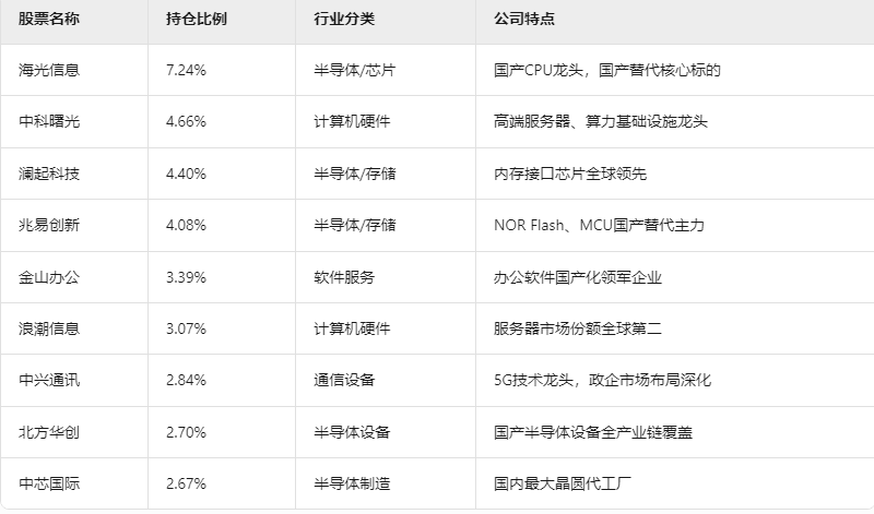 龙头导向:重仓股均为细分领域龙头(如海光信息、中科曙光、澜起科技),体现国产替代逻辑。