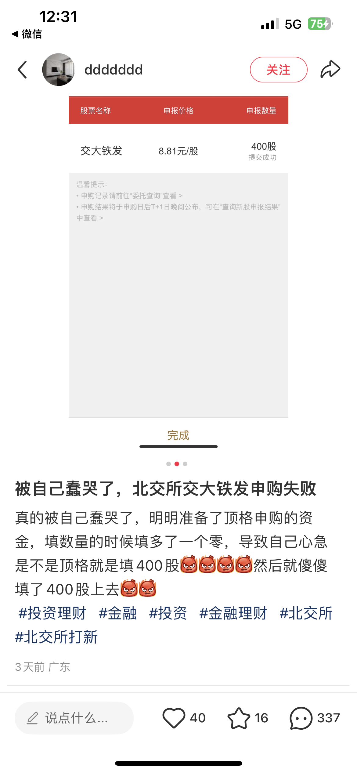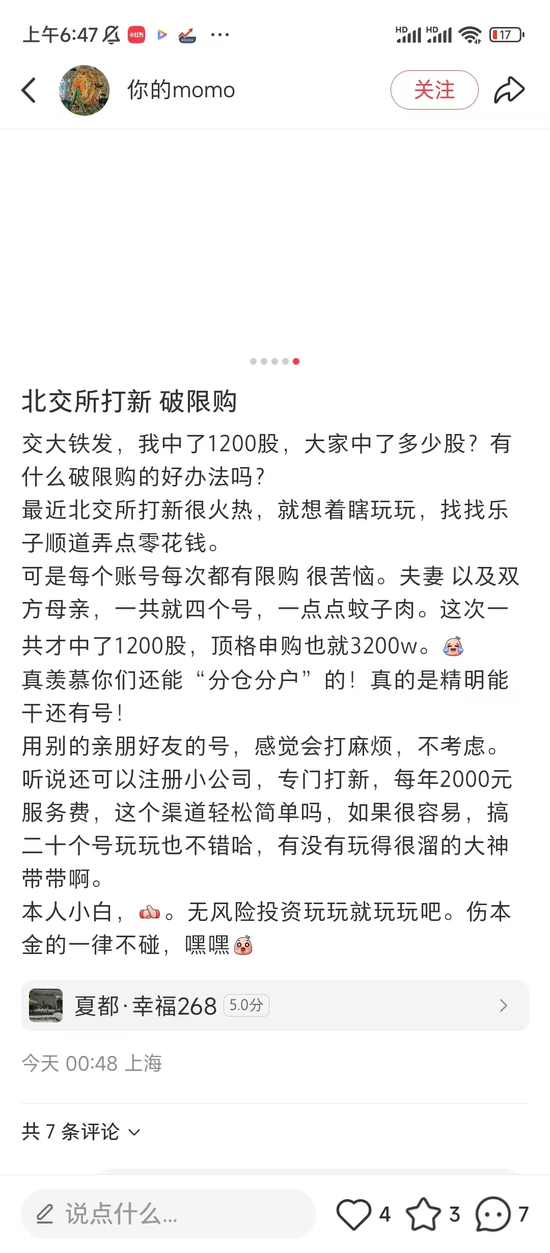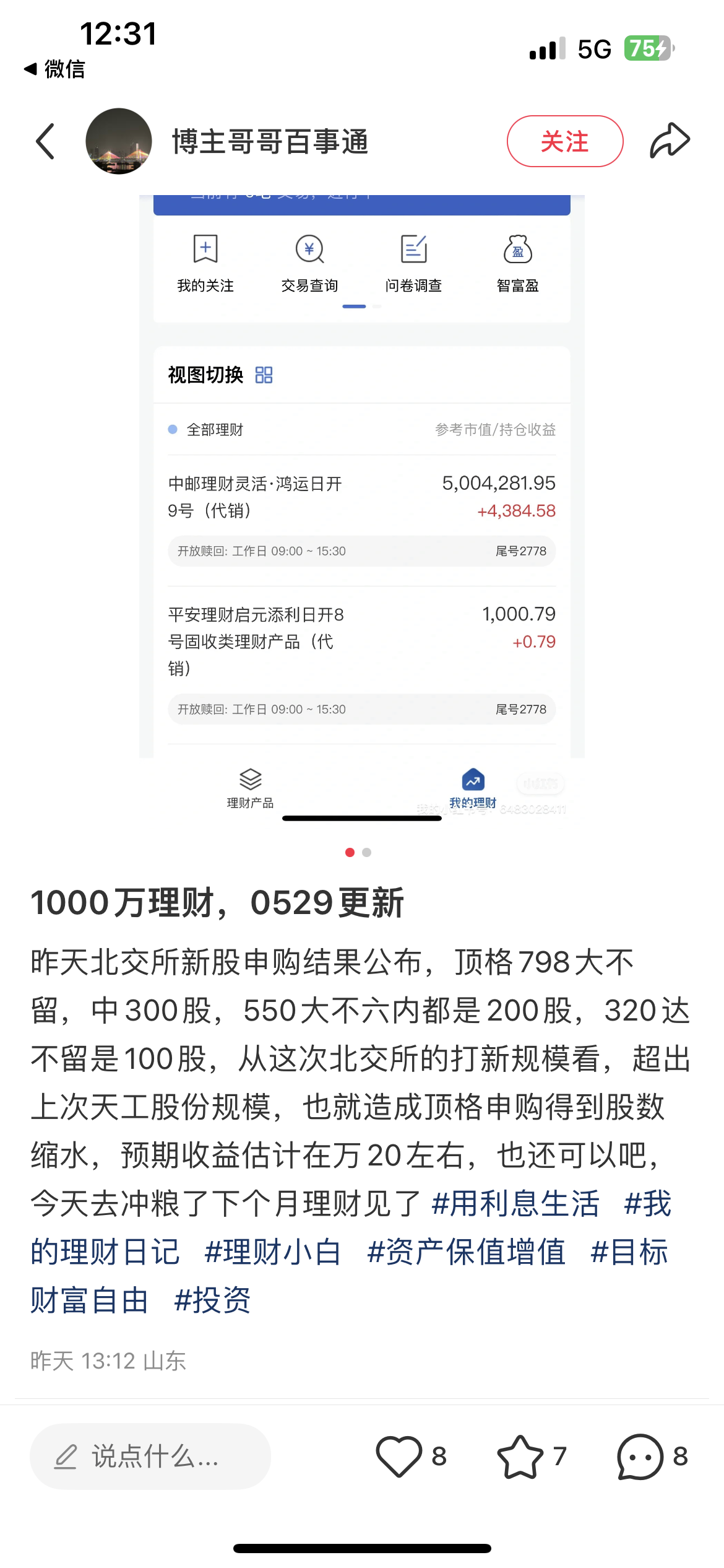 如图,富裕的理财人士,随随便便就拿了上千万去打新股,现在,真的太多人冲进来了,以前做理财的,以前做冲量的,通通都来了,因为,目前北郊打新,是超低风险嘛,感觉第一波生力军,是冲量中介的宣传,导致打新资金大涨。现在,估计第二波生力军在小红书抖音等等平台,他们发帖,普及北郊打新知识,随着越来越普及。将来只会有更多富裕的理财人士,进来打新。