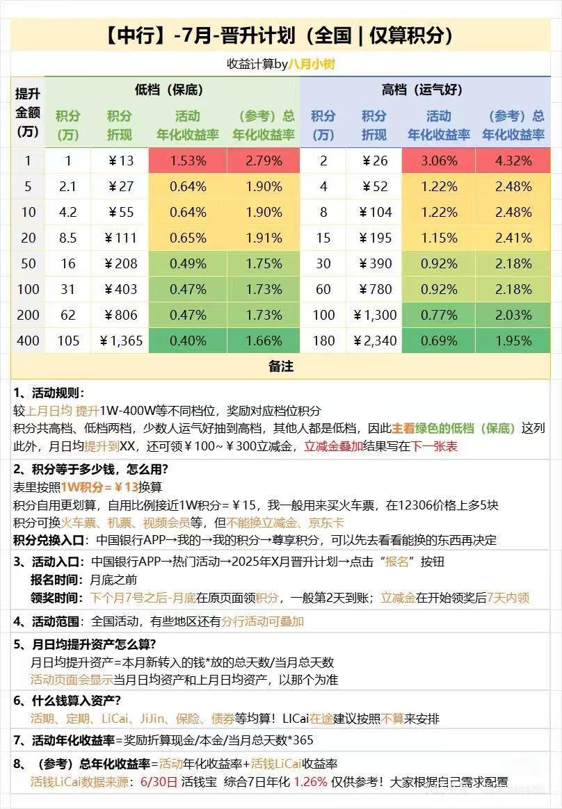 资金量大建议分户,中行积分活动上限是400万档。另外,中行这个月活动积分就少很多了,可以用6月没存的新户再做一个月,然后8月休息,全部户资产清0,迎接力度大的9月活动。