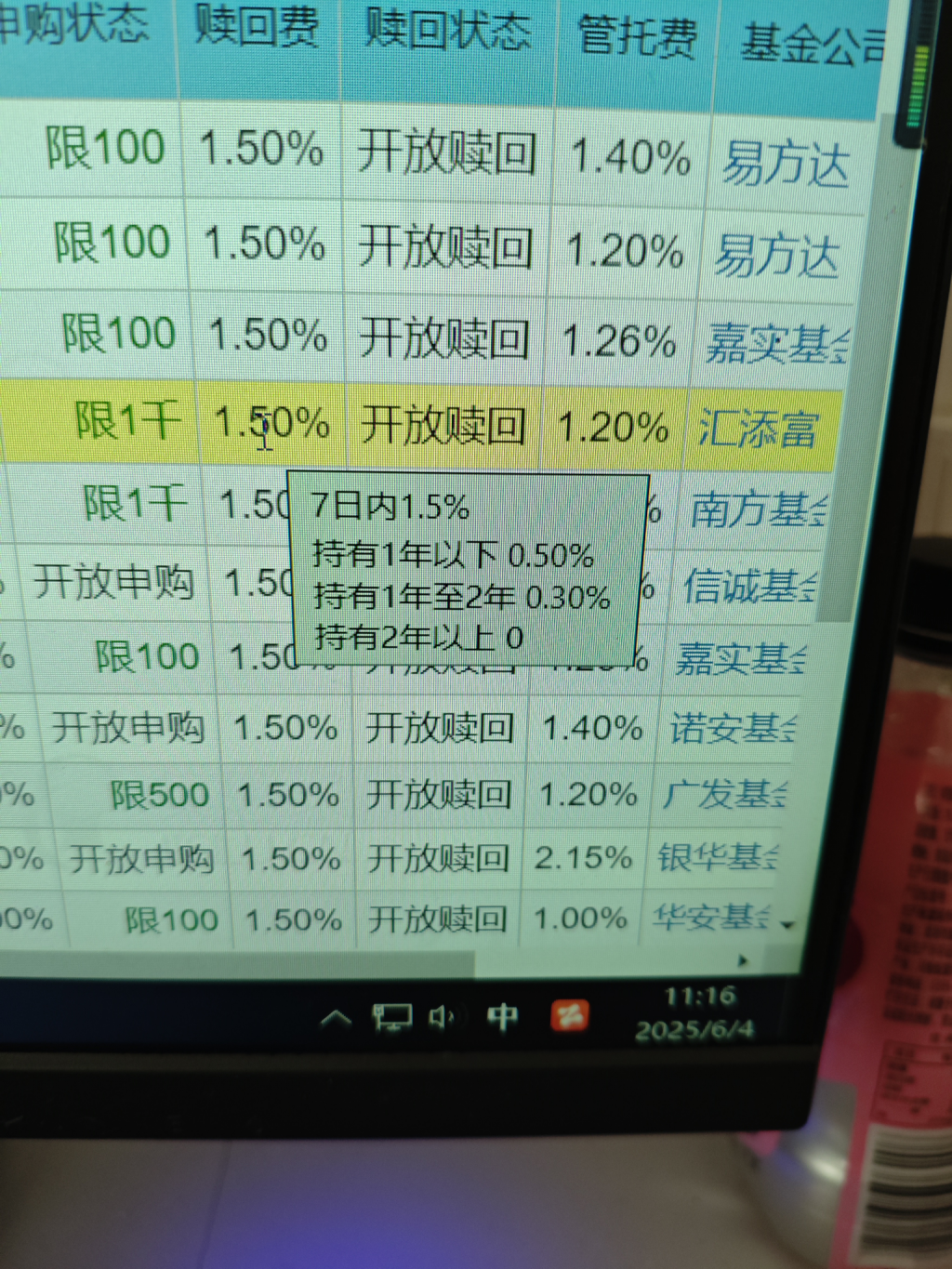 @天书我一个改进建议哈能不能多加一列持有7日的赎回费多少 有的是0.5有的是0.75 还有30天以上才1.5%的 如果不熟悉每次都要去翻公告好累