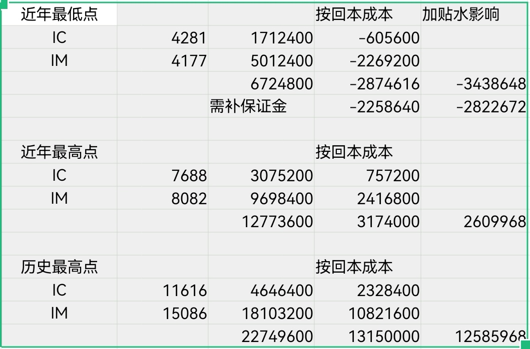按近年最低点算,亏287万,加贴水亏343万,按近年最高点算,盈利317万,加贴水盈利260万,按历史最高点算,盈利1315万,加贴水盈利1258万