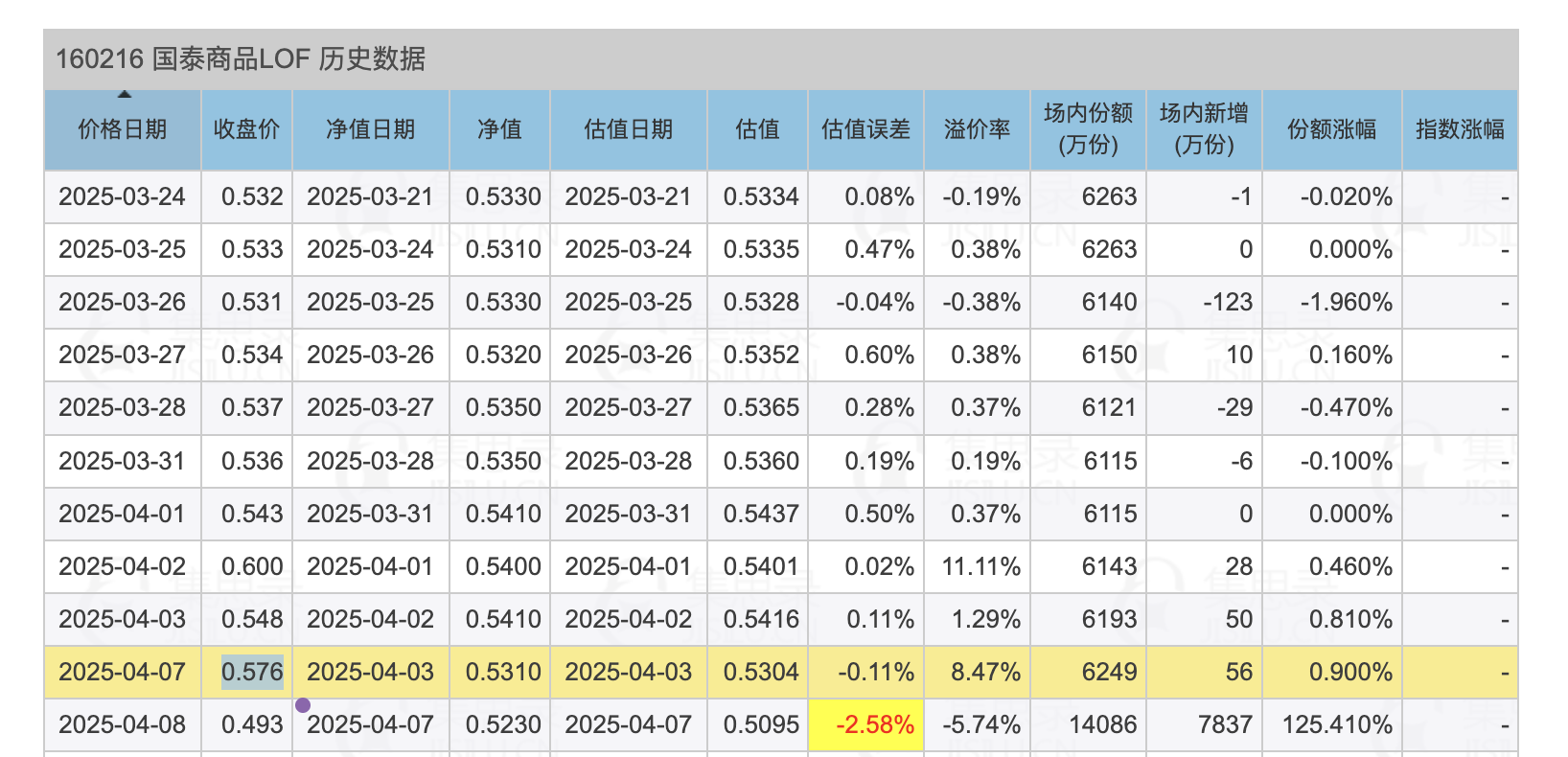 160216 4/7 收盘价显示 0.576,但我这里行情软件上看的是 0.530。其他日期的收盘价也跟我看的有一些差异,不知道是我的问题还是数据的问题。@jisilu