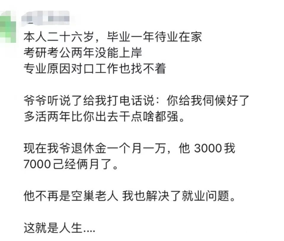 我观察周围失业家庭有一个现象,子女在家躺平,老一辈退休之后还返聘继续上班