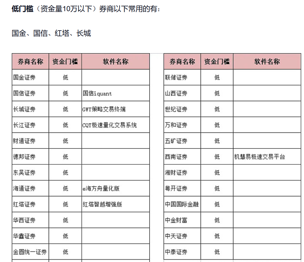 为避免广告嫌疑,这里不作推荐,可以搜索一下,哪些券商支持免费开通或者小金额开通qmt,一般情况下,开通qmt之后就自动开通miniqmt了,miniqmt有个python包可以用在自己编写的程序中,qmt只能在券商客户端中编程,有一定局限。
