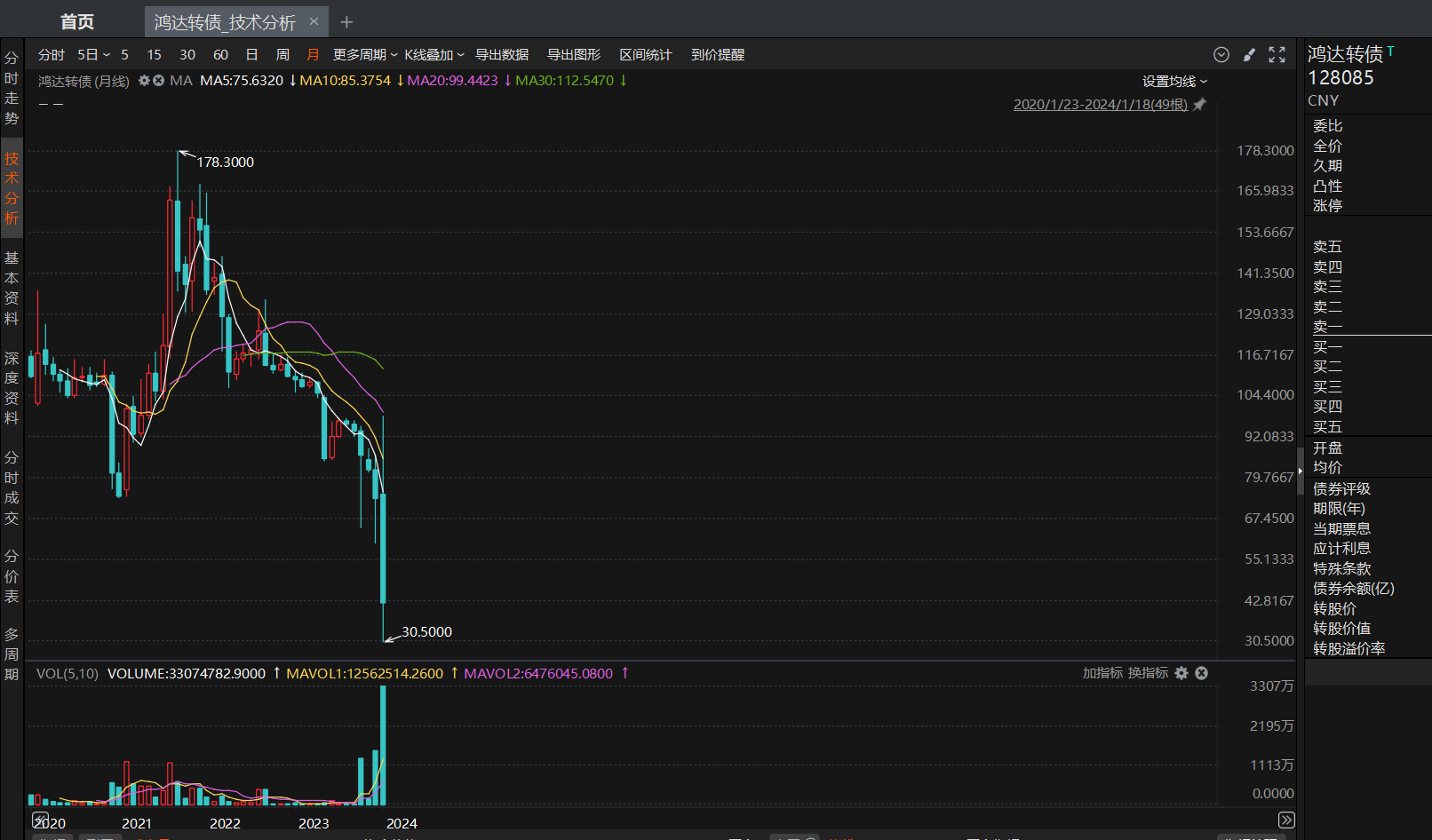 大概在20年,鸿达兴业的控股股东传出债务违约消息,鸿达转债大跌到70元