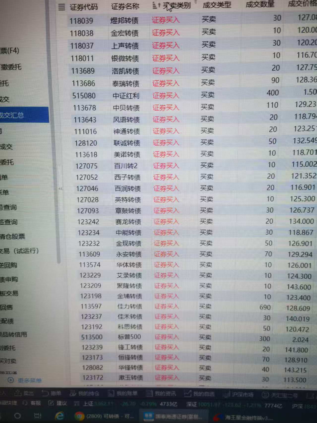 转债午盘成交了364亿,比昨日多7亿,指数下跌了0.49%,A股成交了8060亿,比昨日多400亿...上午减高测 泉峰 华亚 明电2 等多品种,除佳力外,撒胡椒面式买入了多品种...临近午盘一波跳水,也不知道发生啥事,黄金和石油也没大动...昨晚也没发生啥大事,本以为今天北交所申购资金回笼,应该有点起色呢...看样子如公众号中有个兄弟问的,可能还是位置高了,不敢加,都在等,转债有点疲软...准...刚下跌补了点。