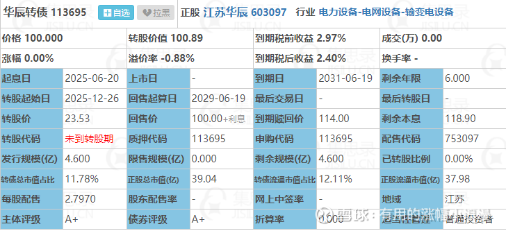 转股价:23.53元,当前正股价23.63元,转股价值≈100.42元,转股溢价率-0.42%。