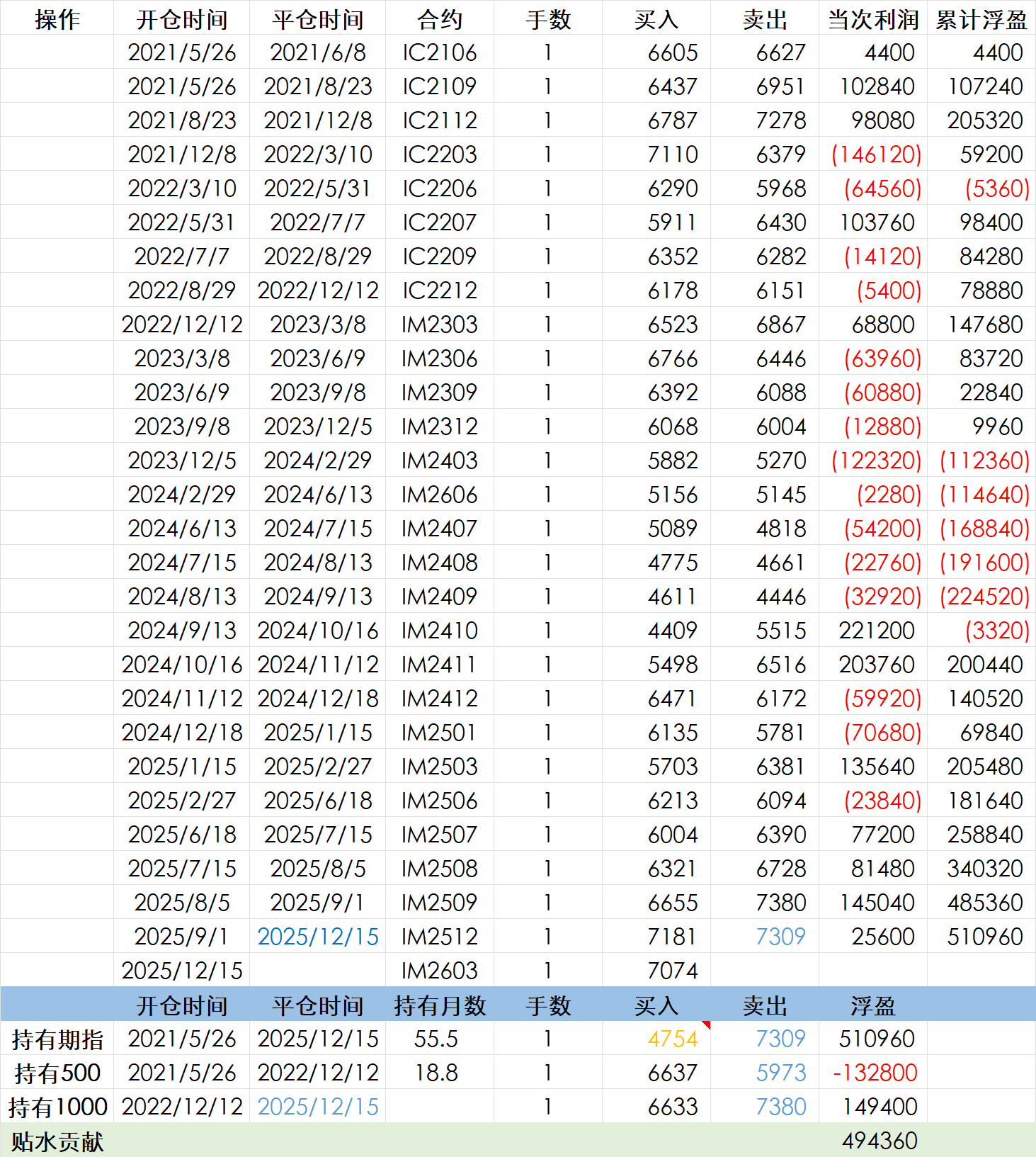 2025年9月10日:更新一下兄弟的吃贴水账单6月、7月、8月指数表现不错,吃贴水账户的浮盈从18万变成了43万。拆分成,指数收益和贴水收益,有42万是贴水收益,指数收益只有1万。收益几乎全靠贴水,这还是建立在最近有一波牛市的基础之上。这就是A股宽基指数的悲哀,吃贴水策略,搞了四年多,基本上是个“只吃贴水”的策略……当然,比买指数基金、ETF、私募基金、公墓基金、自己炒股,还是强多多多多多多多多...请教一下,你记录的习惯是每天记,还是每个月记录一次,也想养成这个习惯