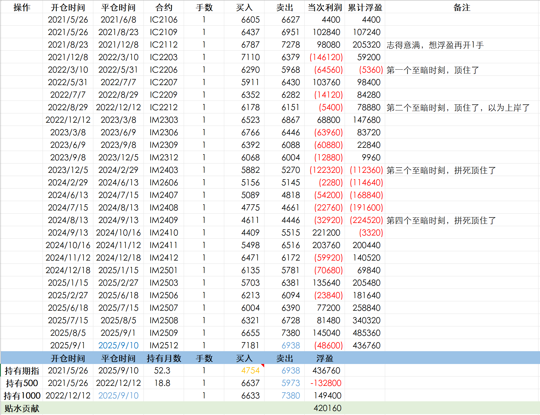 2025年9月10日:更新一下兄弟的吃贴水账单6月、7月、8月指数表现不错,吃贴水账户的浮盈从18万变成了43万。拆分成,指数收益和贴水收益,有42万是贴水收益,指数收益只有1万。收益几乎全靠贴水,这还是建立在最近有一波牛市的基础之上。这就是A股宽基指数的悲哀,吃贴水策略,搞了四年多,基本上是个“只吃贴水”的策略……当然,比买指数基金、ETF、私募基金、公墓基金、自己炒股,还是强多多多多多多多多...请教一下,你记录的习惯是每天记,还是每个月记录一次,也想养成这个习惯