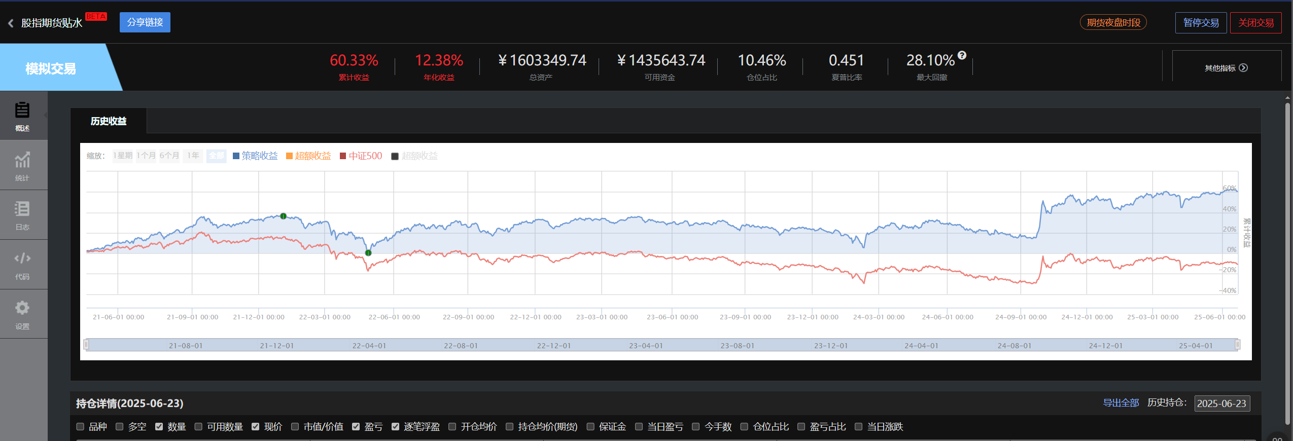 这个策略仓位控制是最重要的,关于浮盈加仓照理上是可以的,但是前提是一定要计算好、设置好回撤减仓,不能上涨加仓、下跌死扛,然后一直扛到不能抗割肉这是最痛的。。。