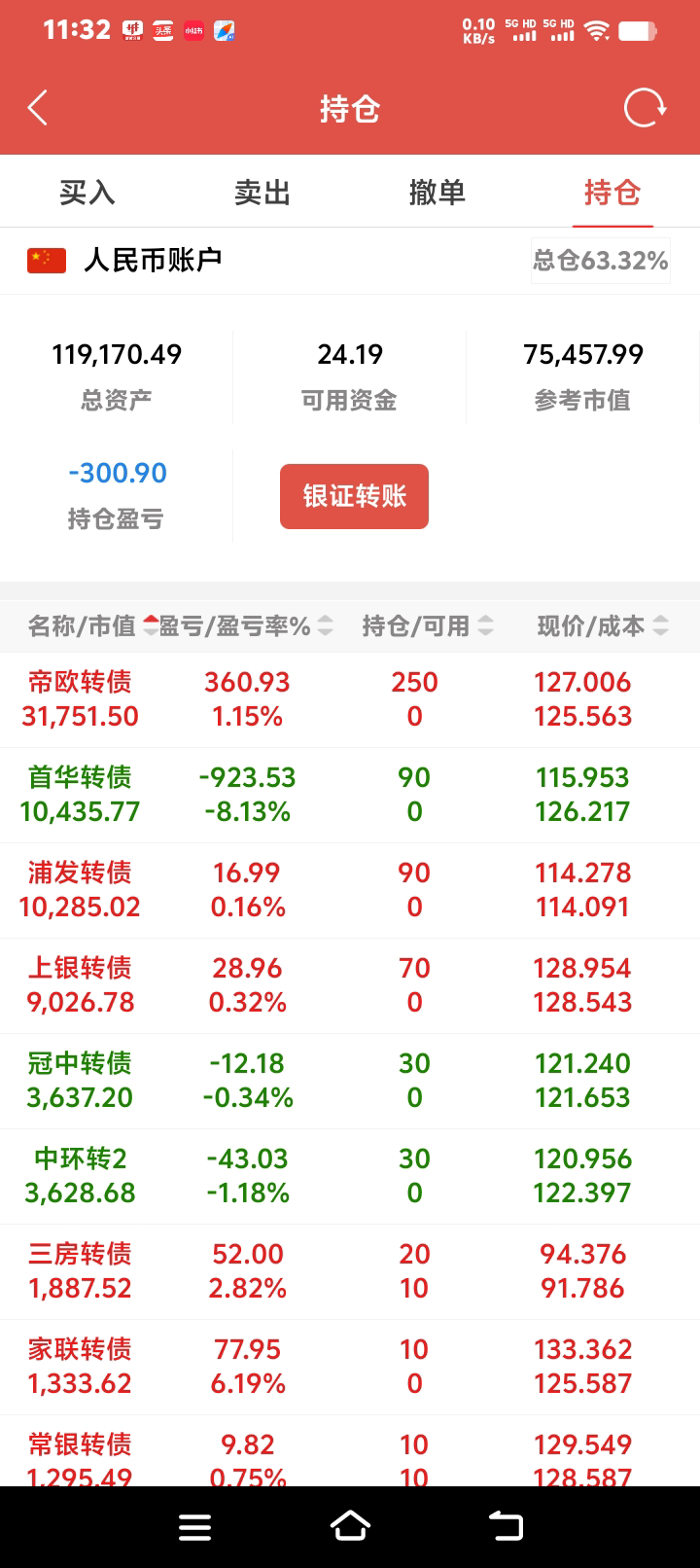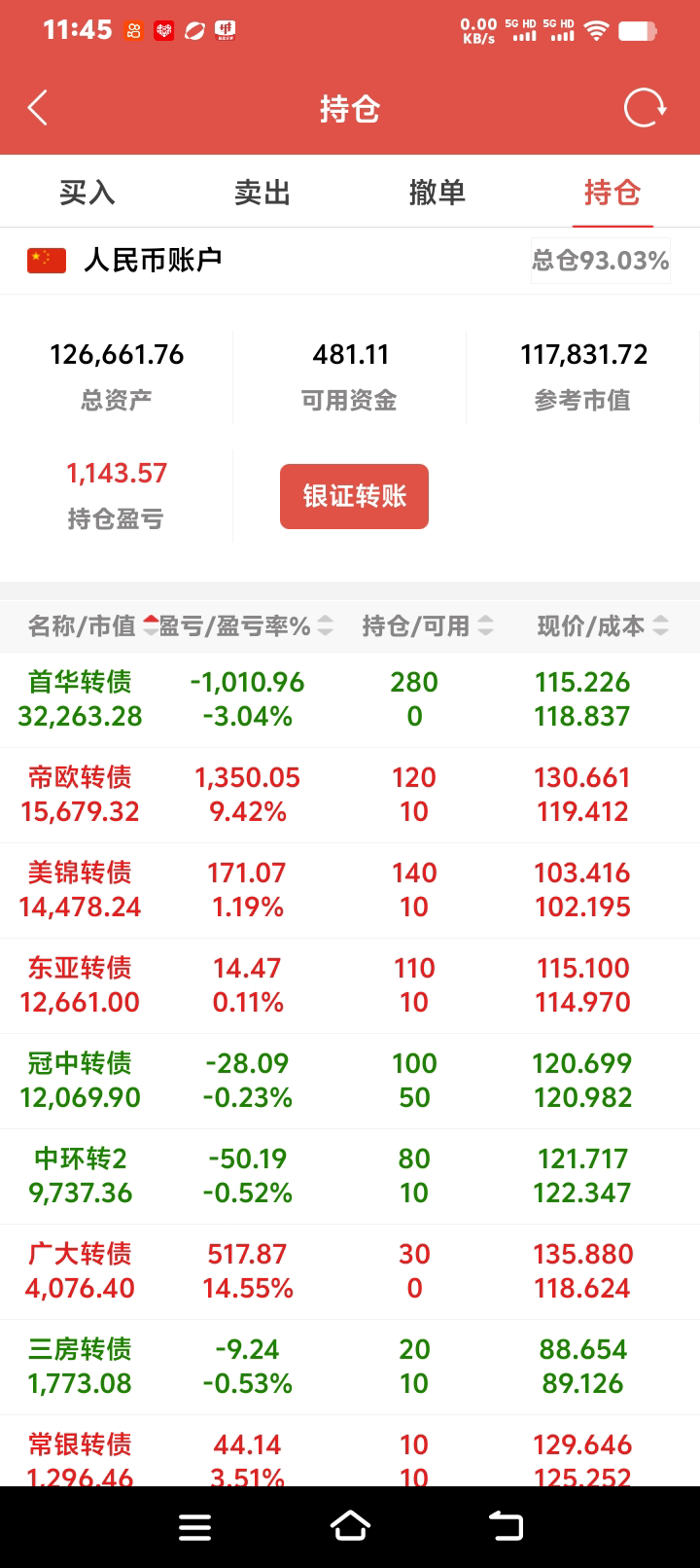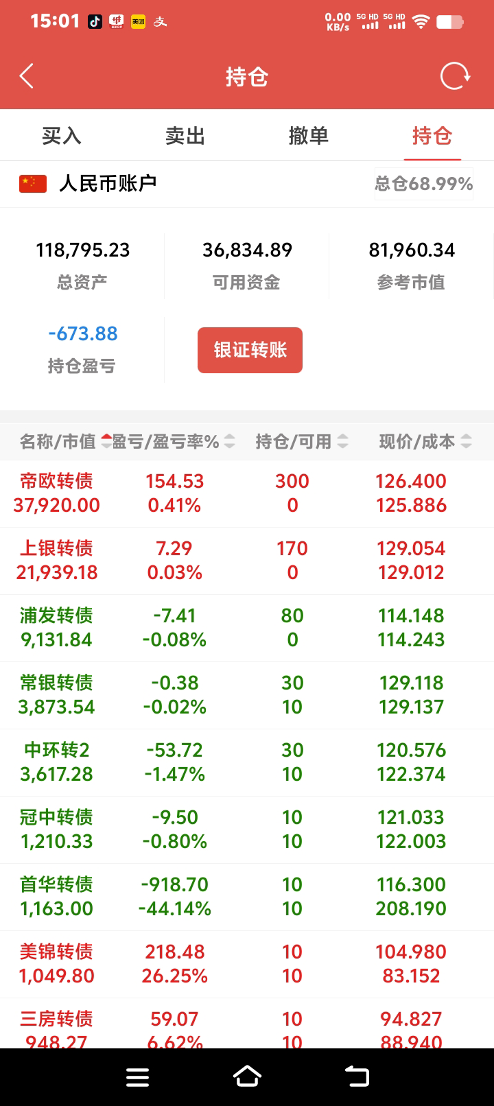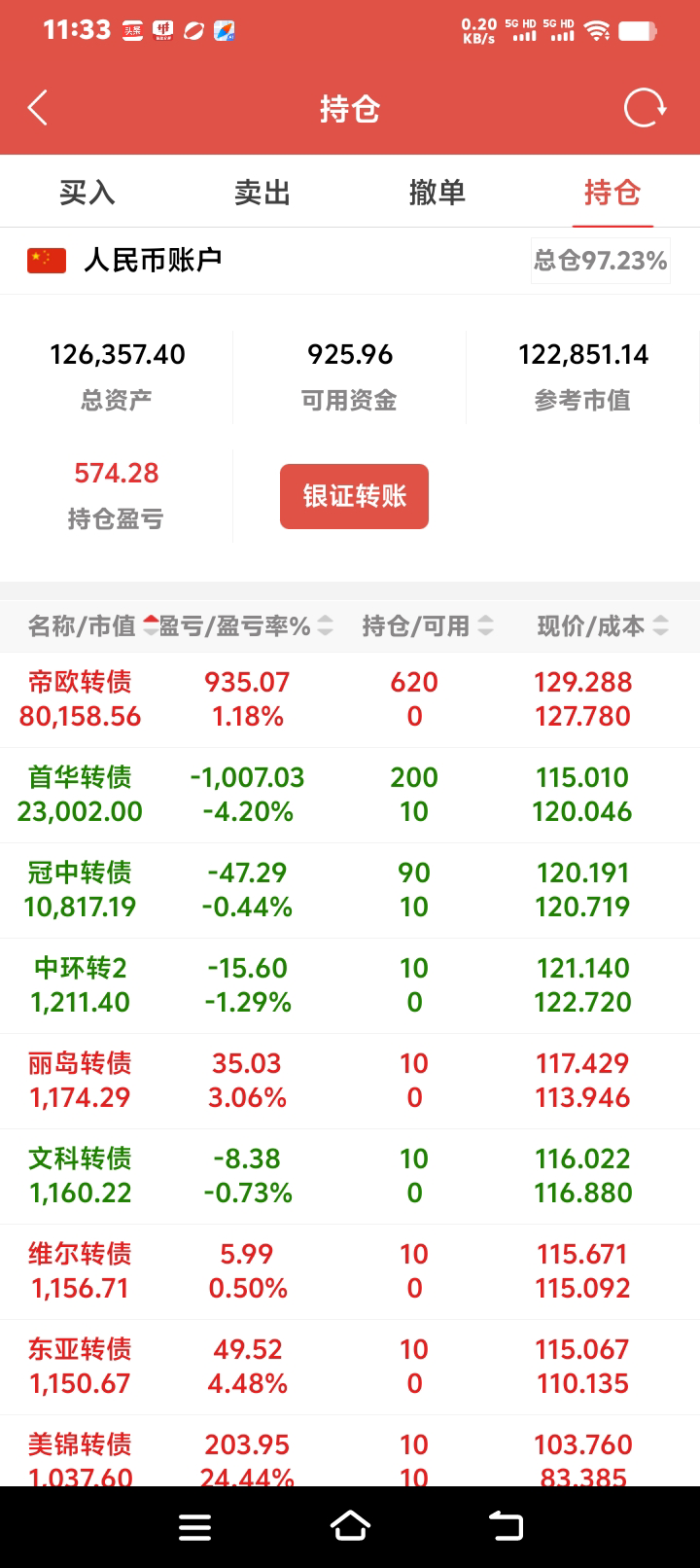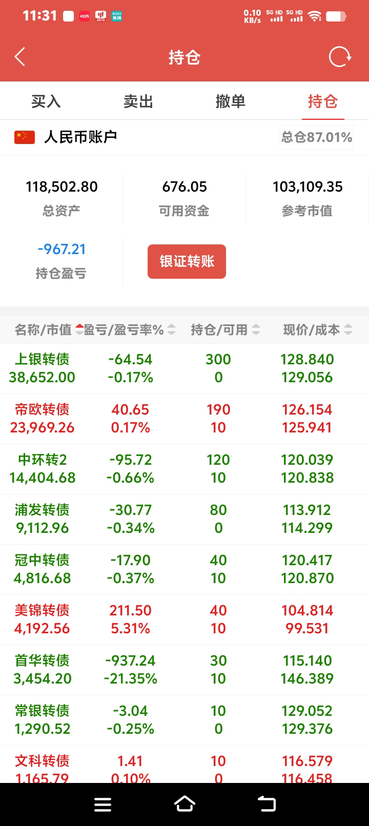 昨天减仓了。今天转出资金了。帝欧转债也做红了。这持仓有哪些问题,欢迎留言或者私信指教!