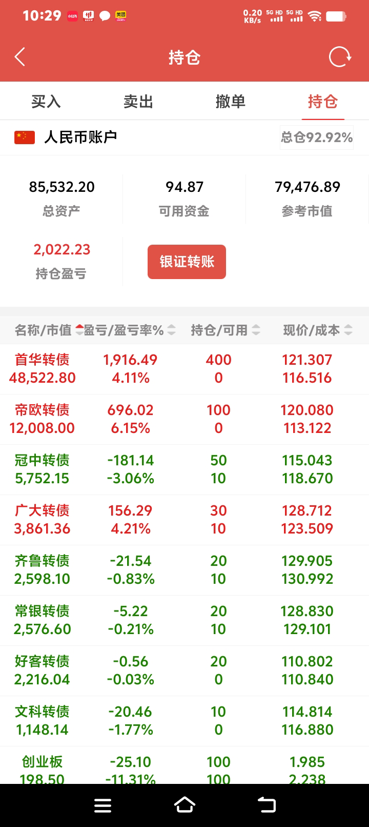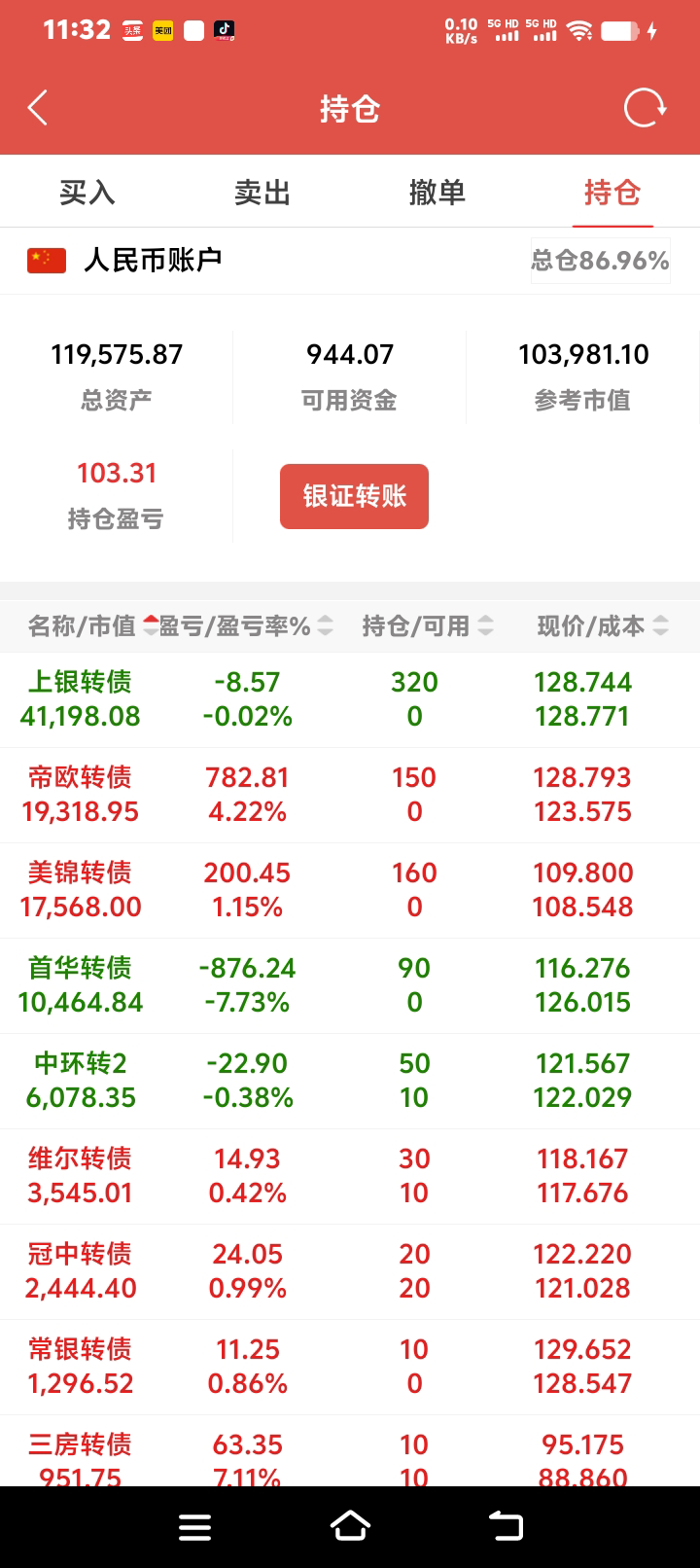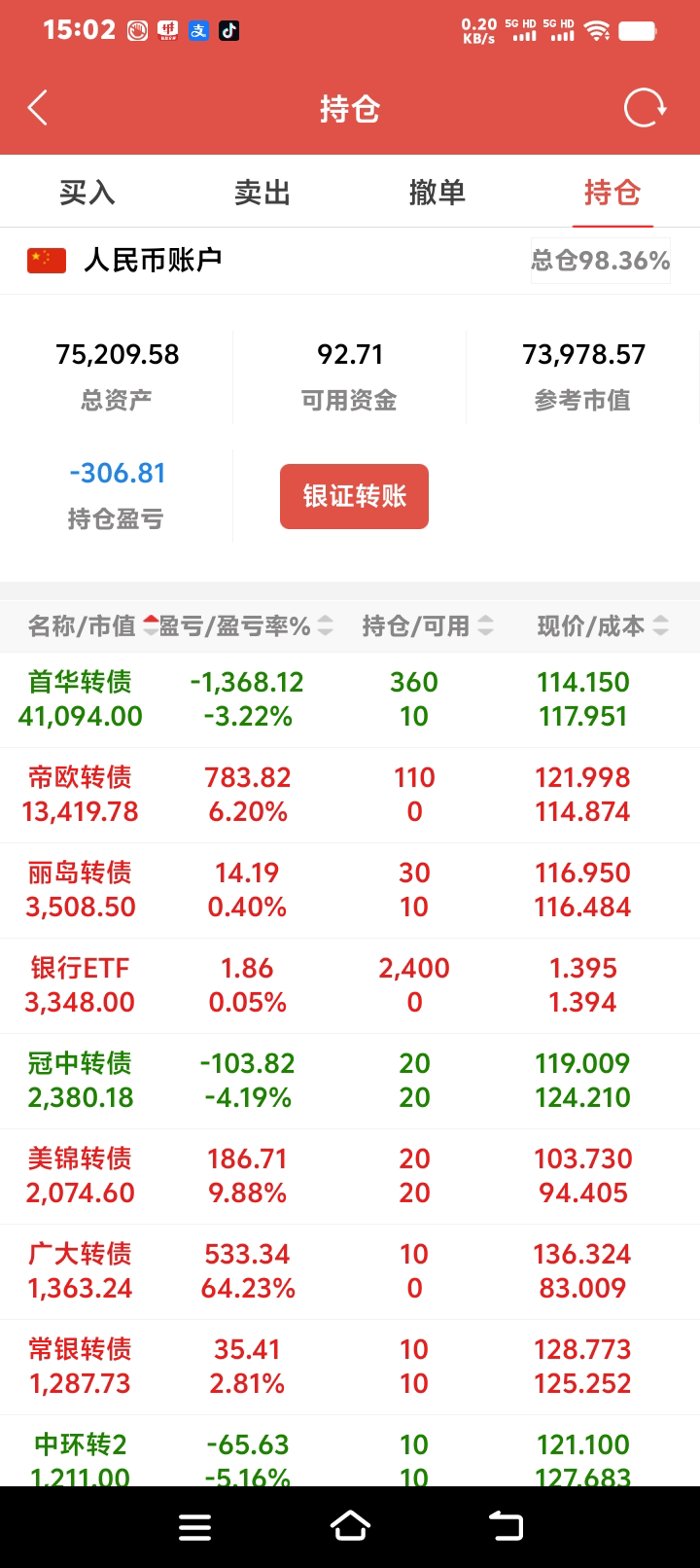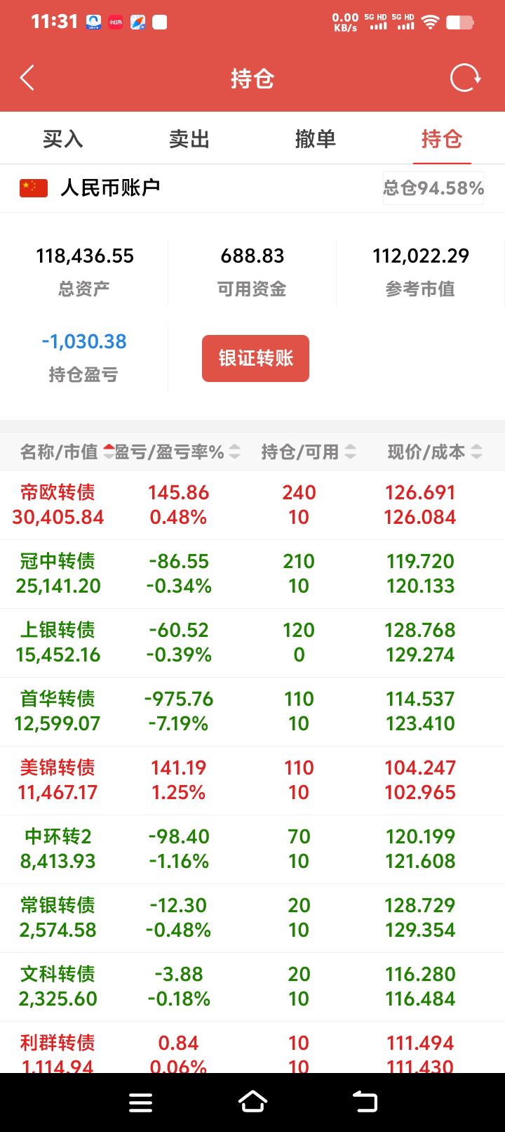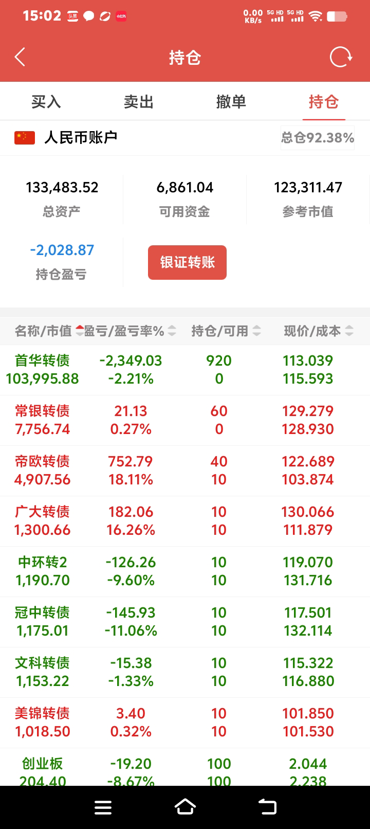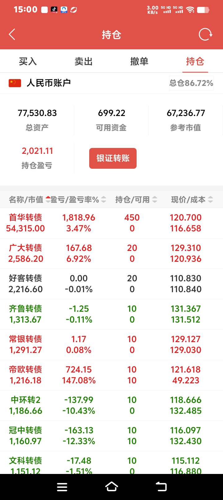 昨天减仓了。今天转出资金了。帝欧转债也做红了。这持仓有哪些问题,欢迎留言或者私信指教!