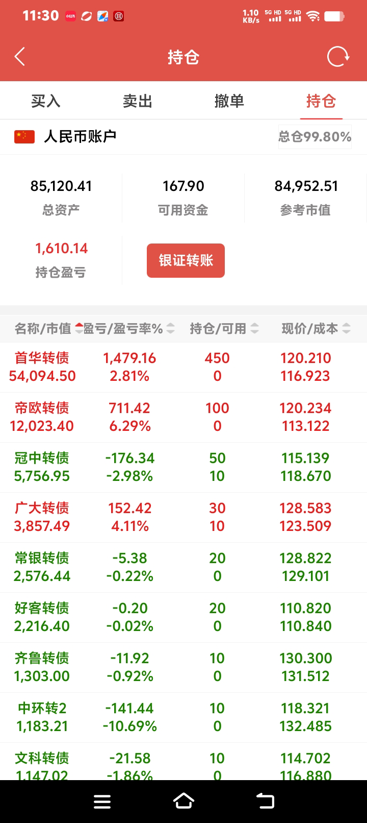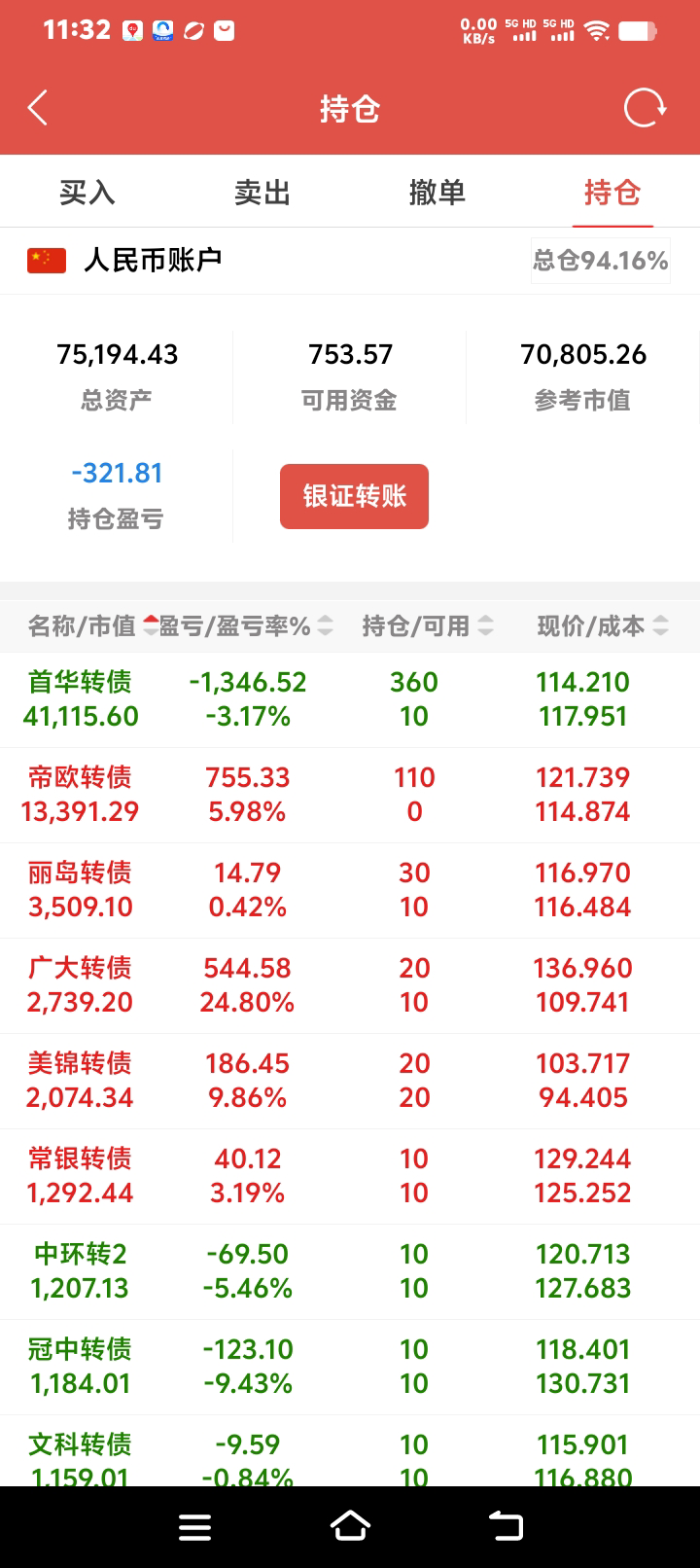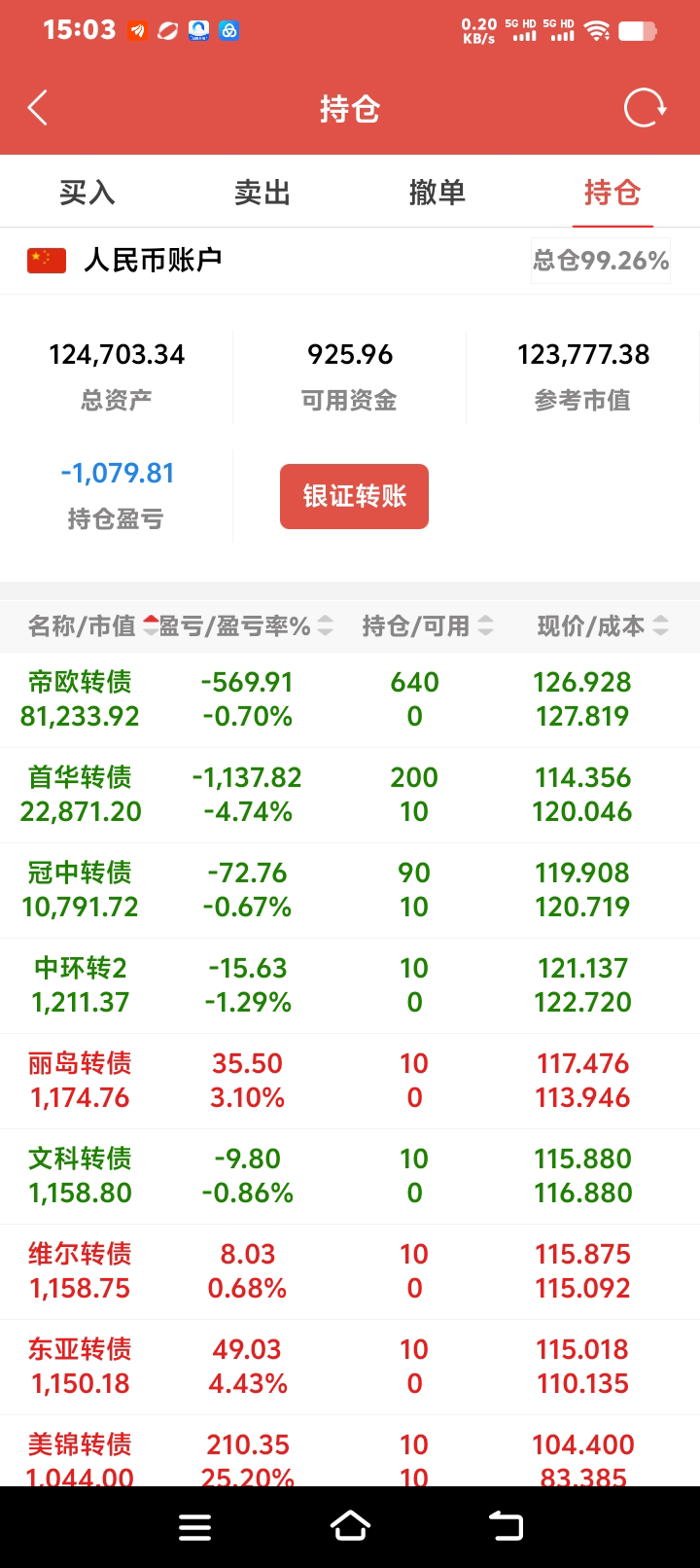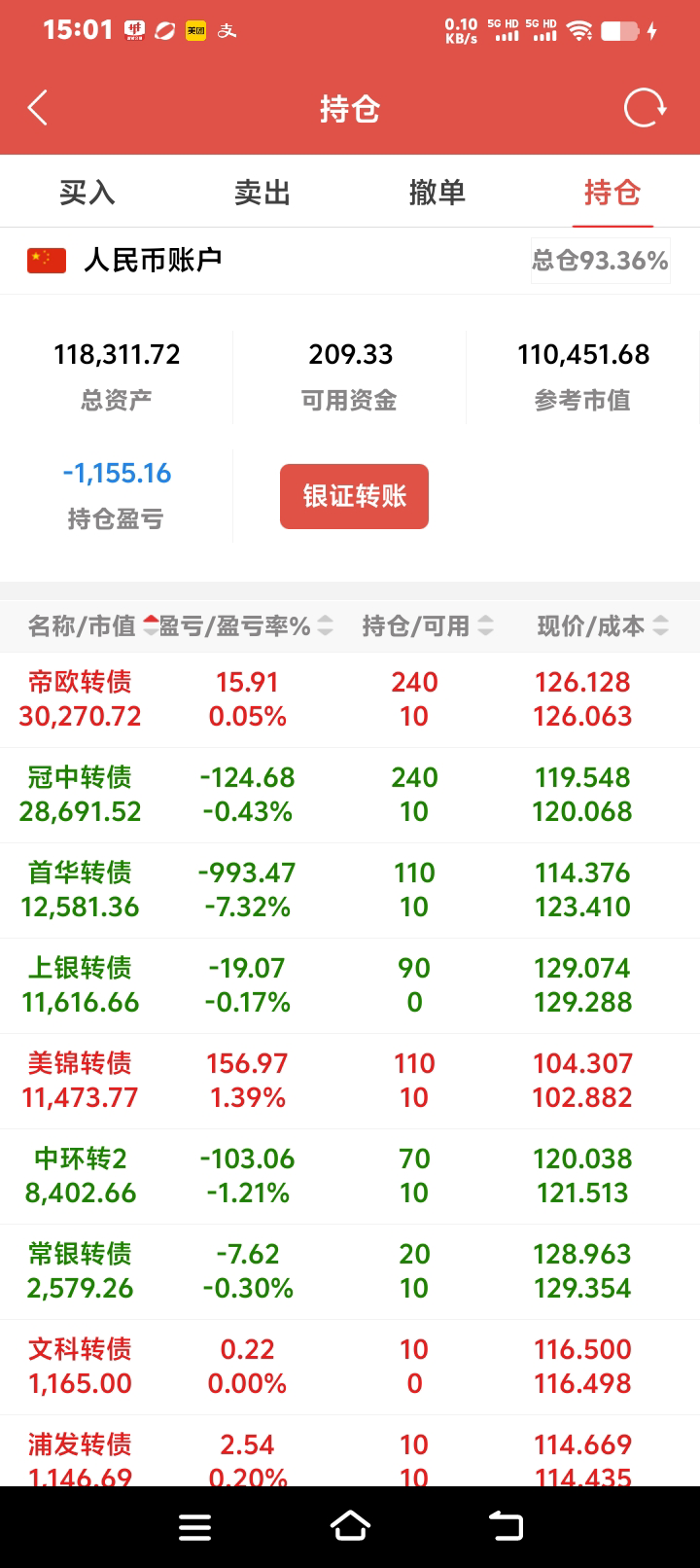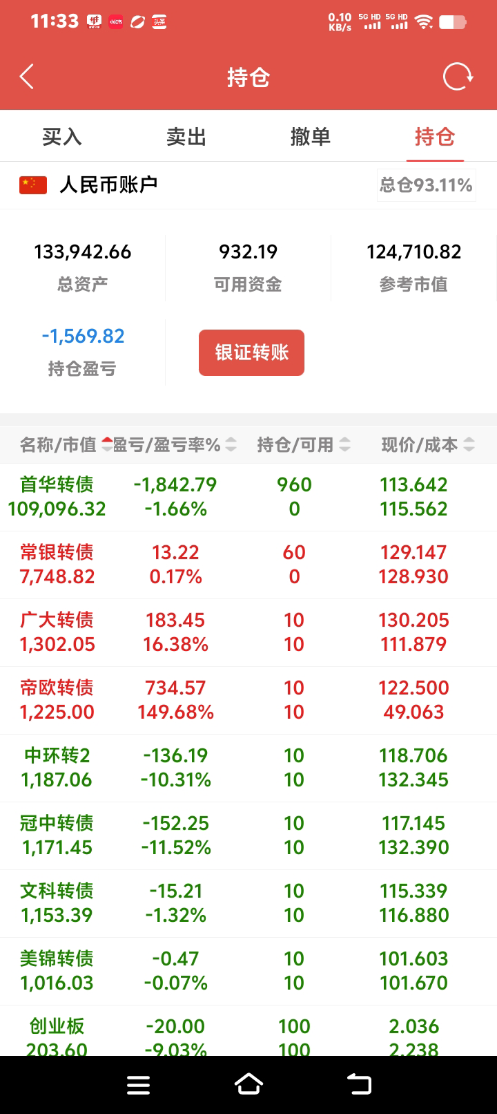 昨天减仓了。今天转出资金了。帝欧转债也做红了。这持仓有哪些问题,欢迎留言或者私信指教!