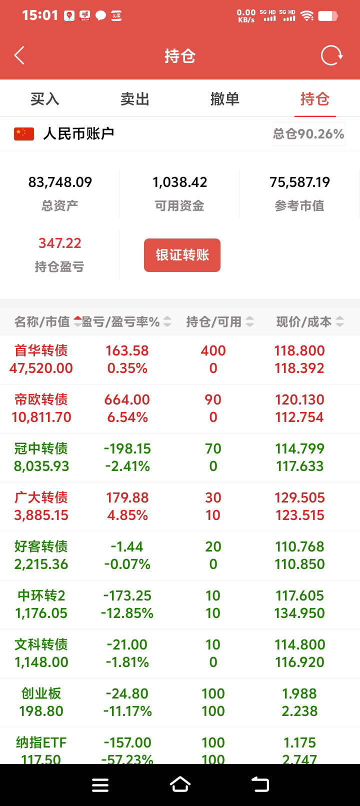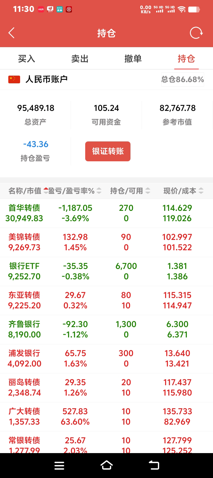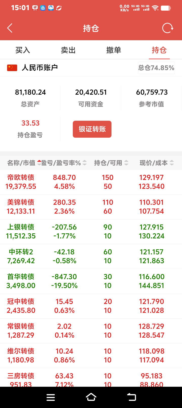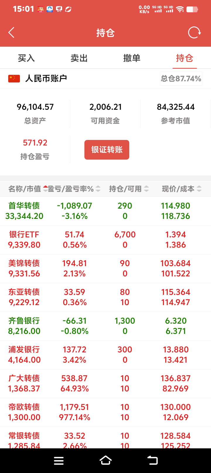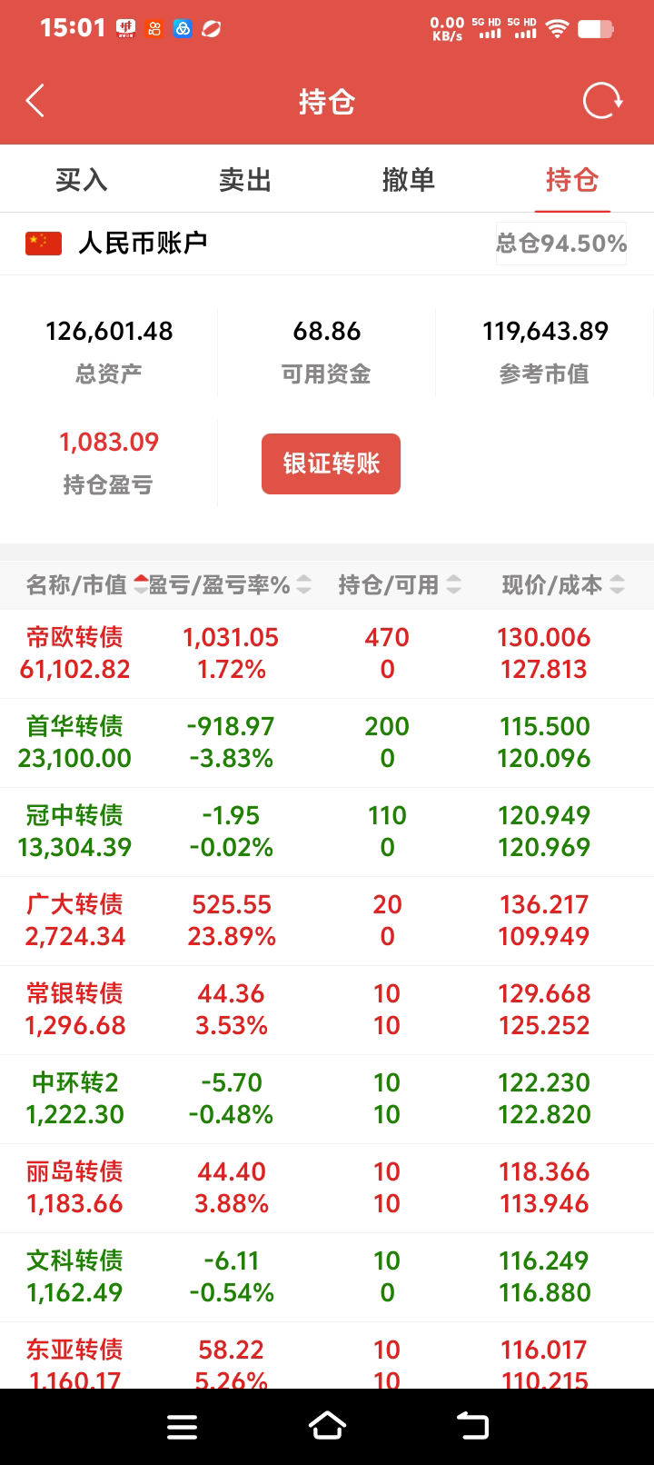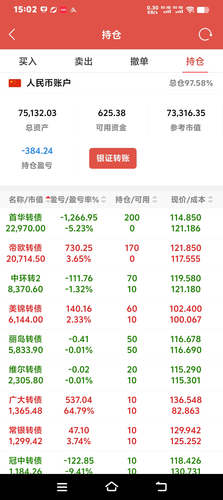 昨天减仓了。今天转出资金了。帝欧转债也做红了。这持仓有哪些问题,欢迎留言或者私信指教!